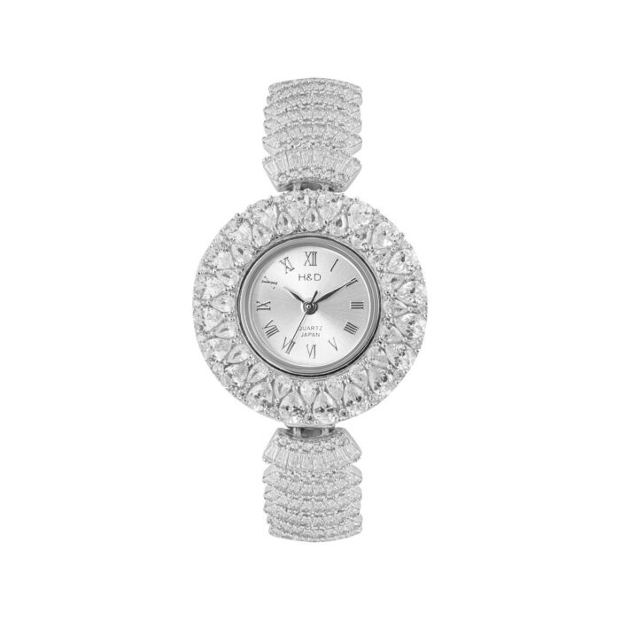 ما تمام ساعت‌ها را با نقره ۹۲۵ اصل می‌سازیم و آن‌ها را با آبکاری طلای سفید پوشش می‌دهیم تا دوام و درخشندگی بالایی داشته باشند. برای درخشش بیشتر، از نگین‌های سوپراستار درجه یک مثل برلیان، تیپرز و باگت در طراحی استفاده می‌کنیم. این نگین‌ها در برابر کدر شدن مقاوم هستند و با دقت در بدنه ساعت‌ها جای می‌گیرند.