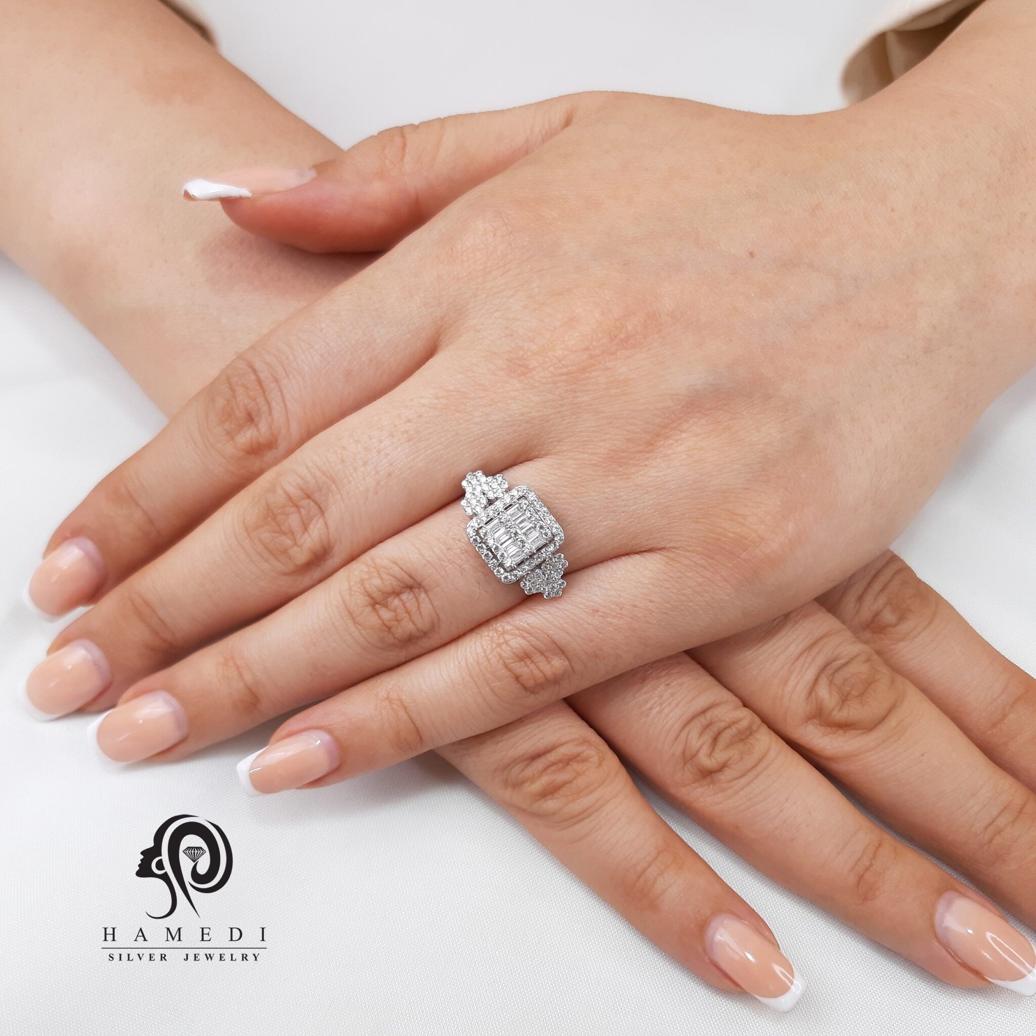انگشتر نقره زنانه مجلسی ظریف لوکس مدل RIL F1 یکی از لوکس ترین و پرطرفدار ترین انگشتر های مجلسی نقره حامدی است.