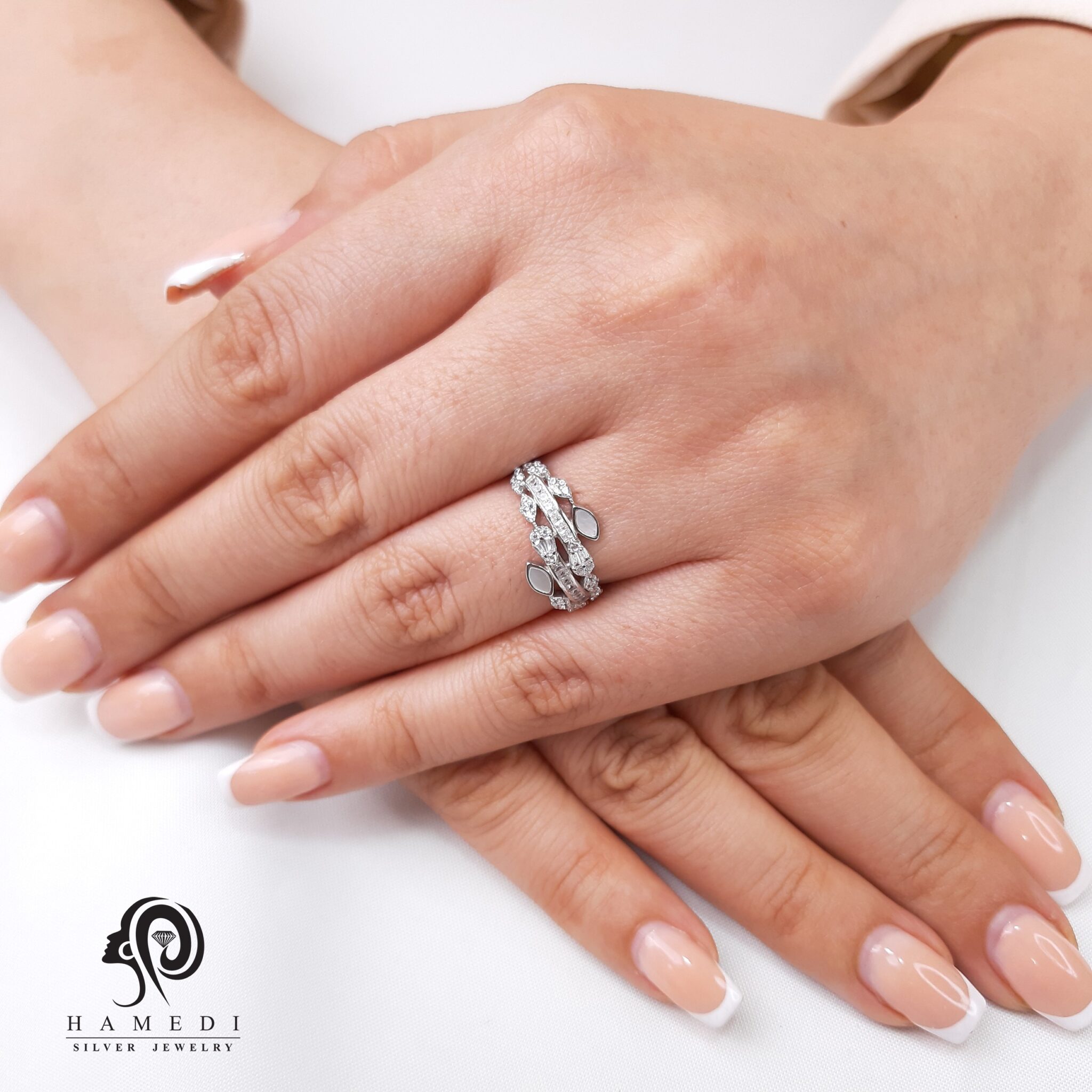 انگشتر نقره زنانه فری سایز صدفی مدل RE S25 یکی از لوکس ترین و پرطرفدار ترین انگشتر های مجلسی گالری نقره حامدی است.