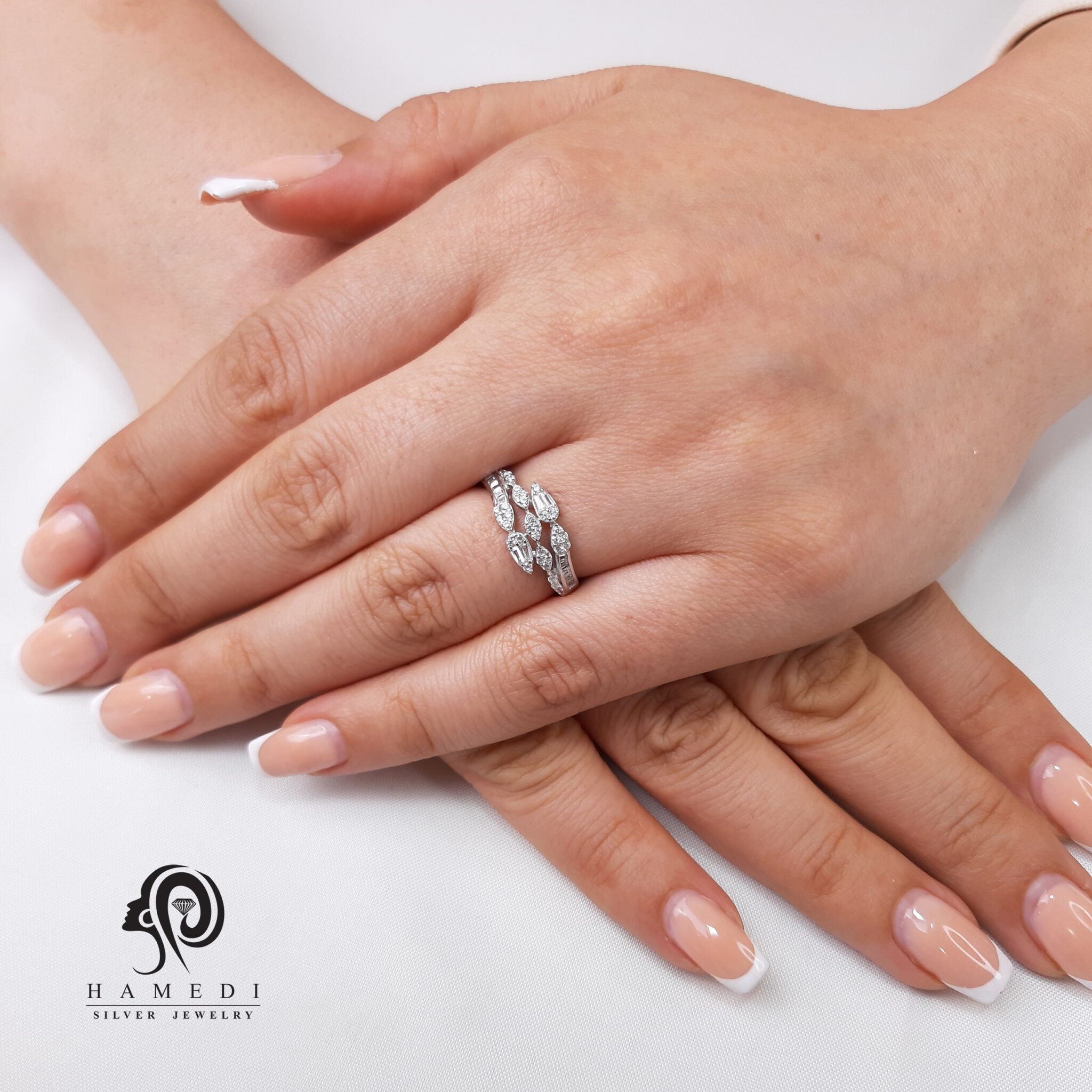 انگشتر نقره زنانه ظریف و مجلسی مدل RE S14 یکی از لوکس و پرطرفدارترین انگشتر های مجلسی گالری حامدی است.