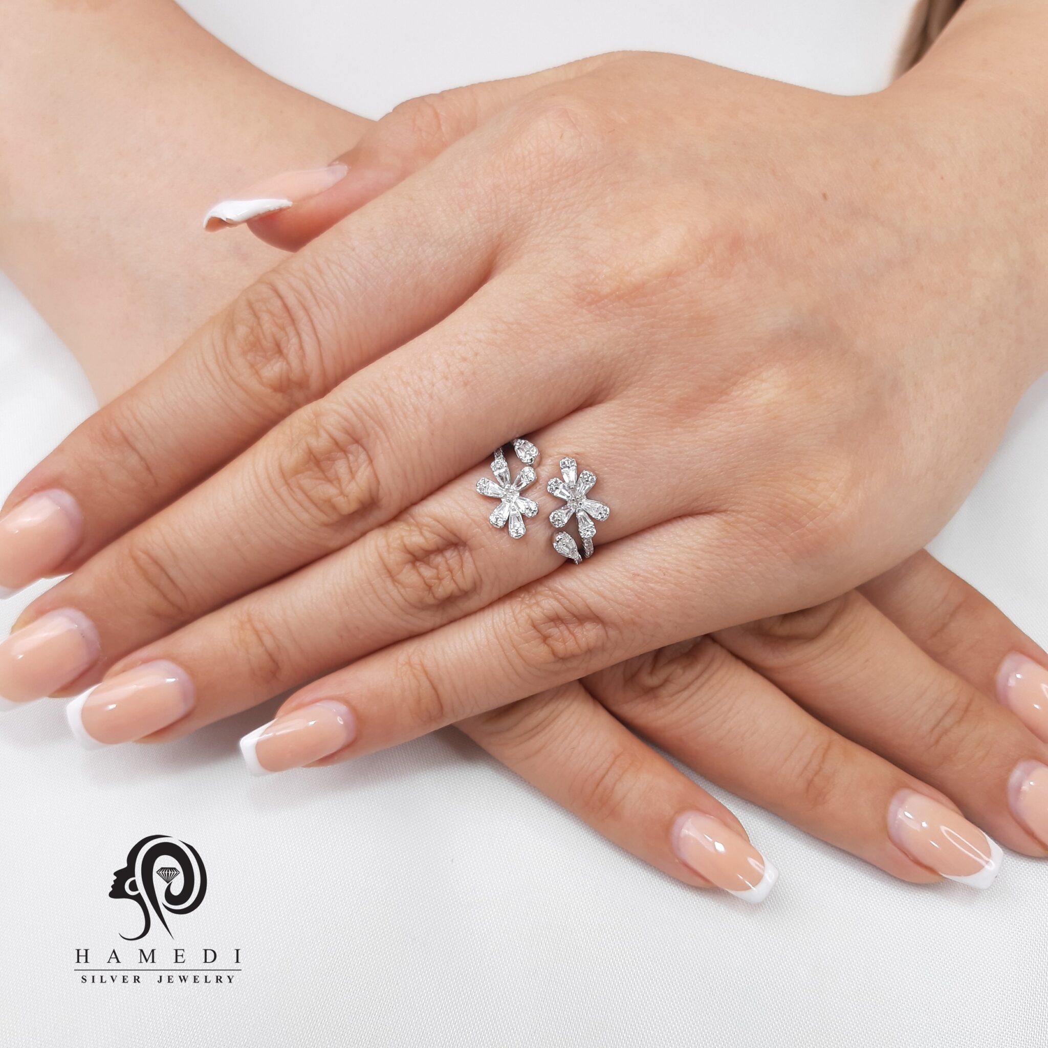 انگشتر نقره زنانه طرح گل مدل RE S26 یکی از لوکس ترین و پرطرفدار ترین انگشتر های مجلسی گالری حامدی است.