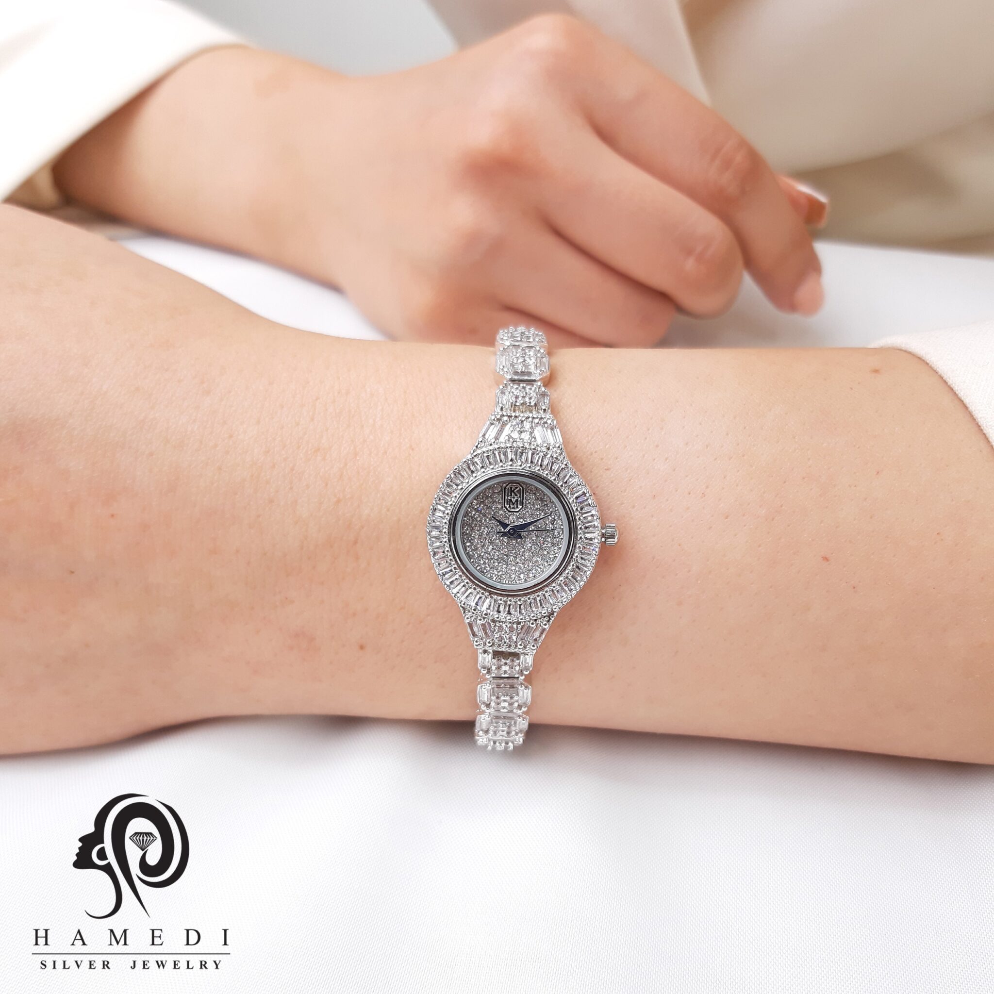 ساعت نقره زنانه مجلسی نگین دار مدل WI E8 G3 یکی از زیبا ترین ساعت های شیک و مجلسی گالری نقره حامدی است.