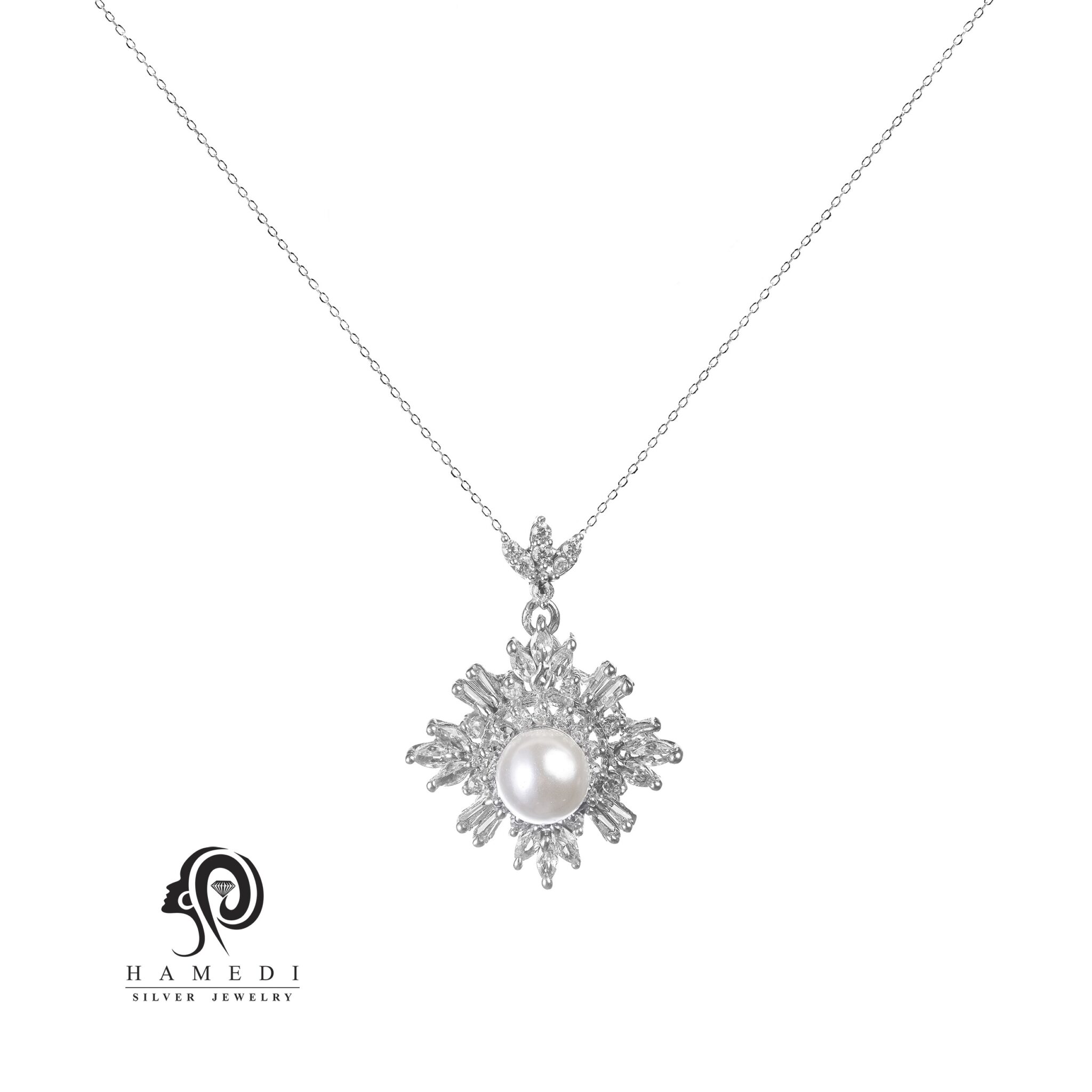 مدال زنانه مروارید خور نقره جواهری مدل MI Y7 یکی از زیباترین ترین و پرطرفدار ترین مدال های مجلسی گالری نقره حامدی است.