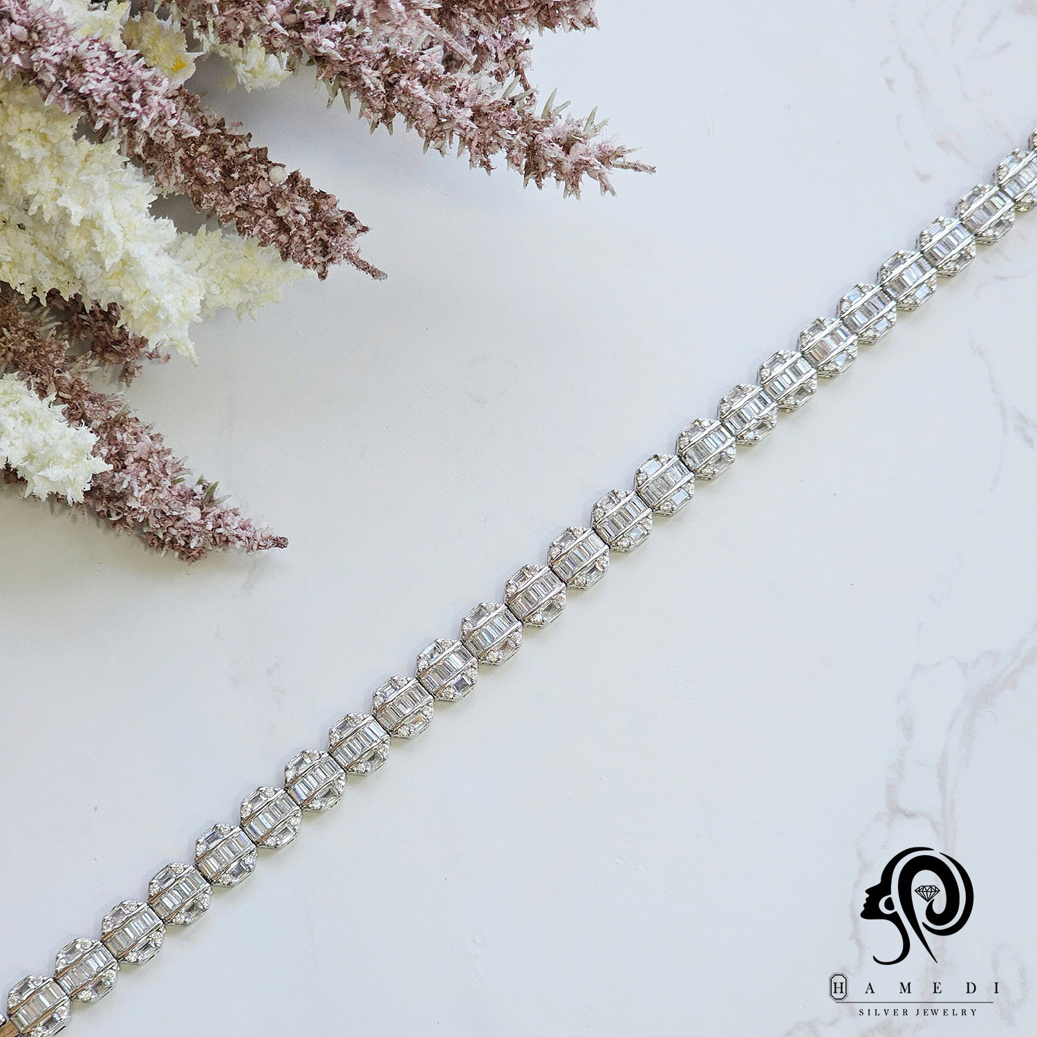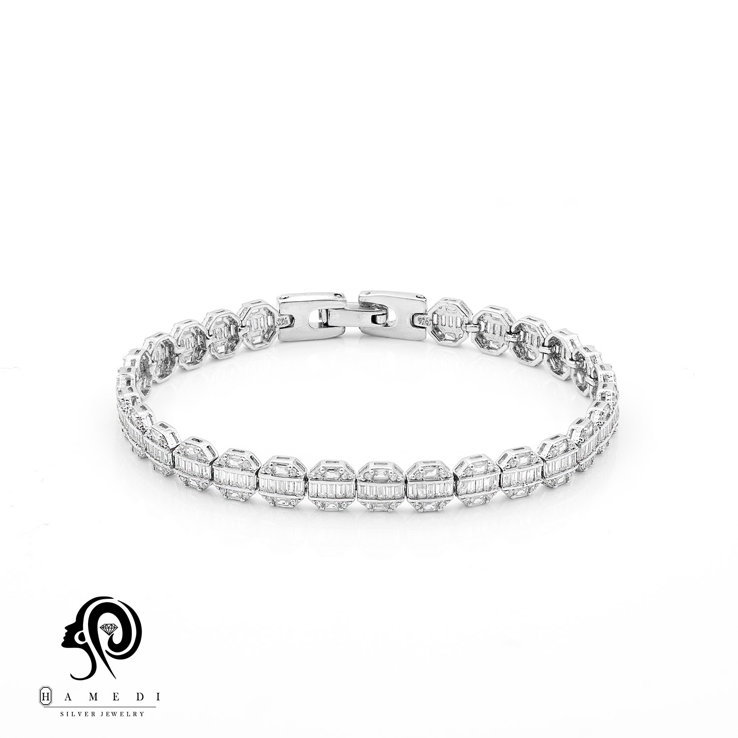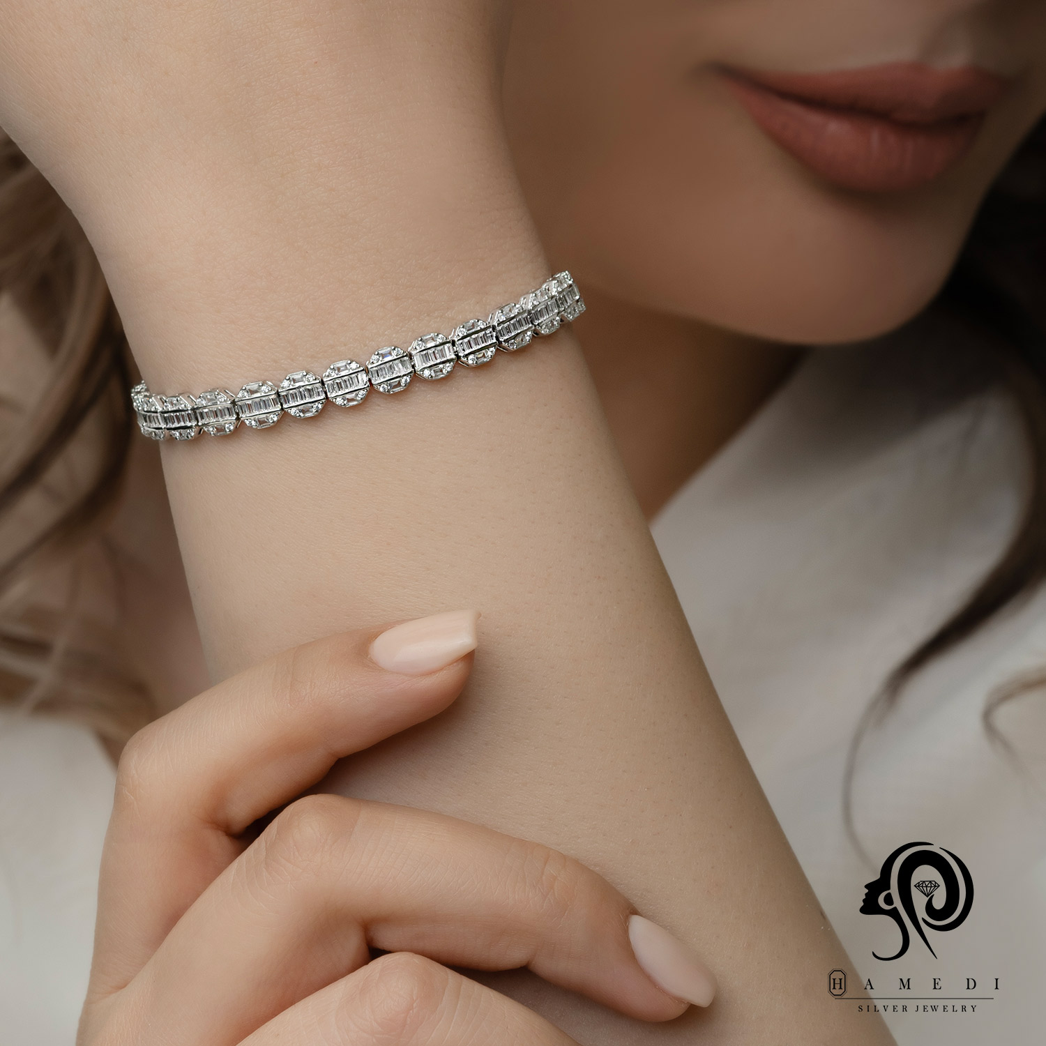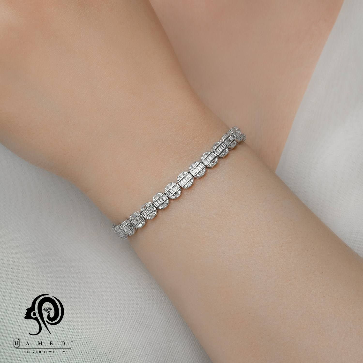 دستبند نقره زنانه مجلسی جواهری مدل BI E11 از ظریفترین و پرطرفدارترین دستبند های مجلسی گالری حامدی است.