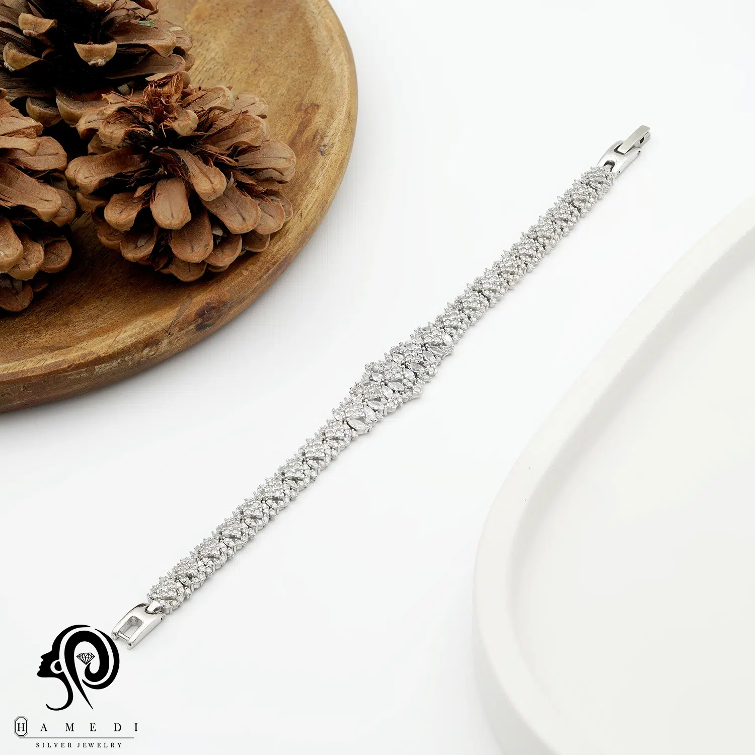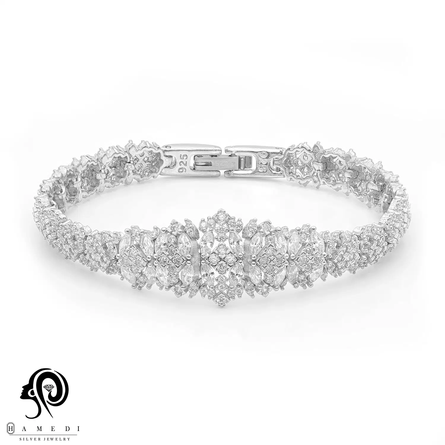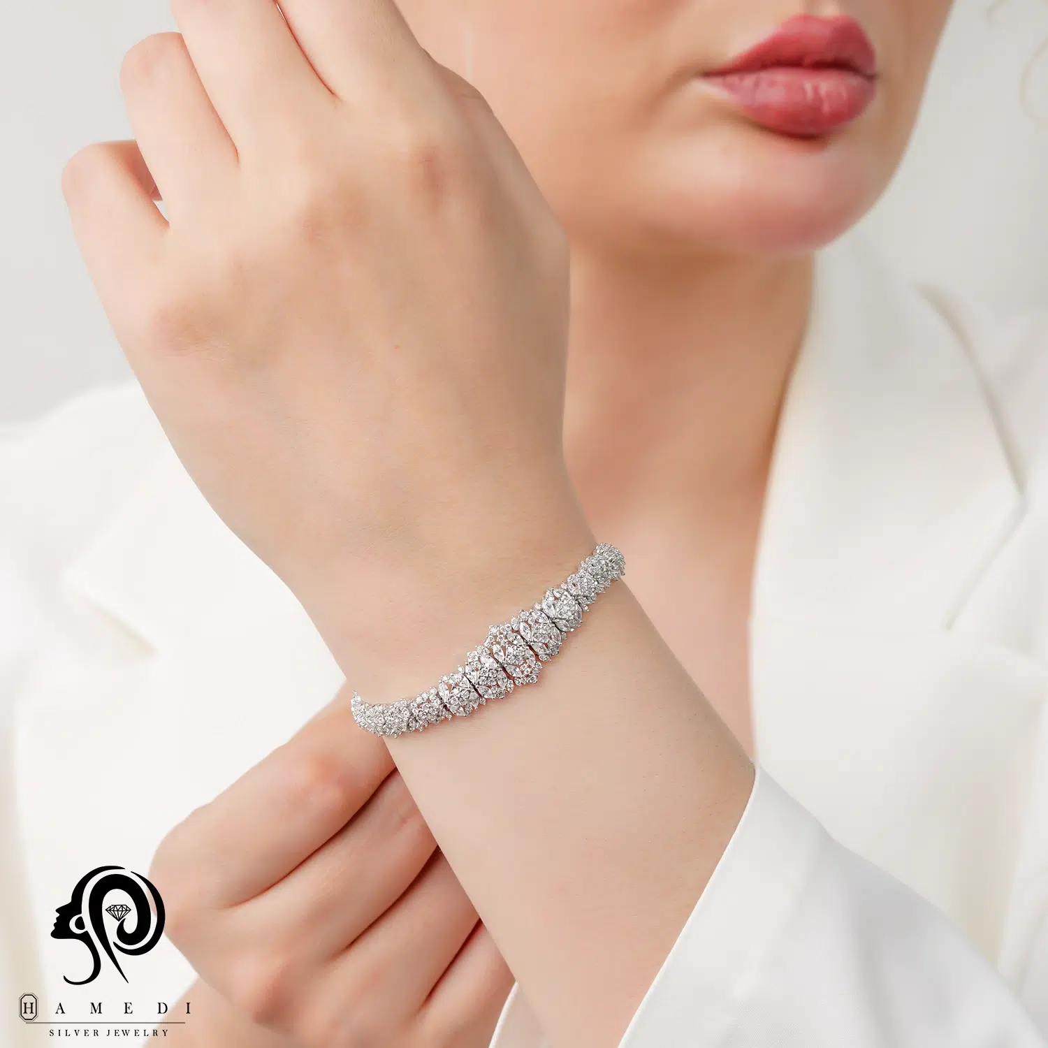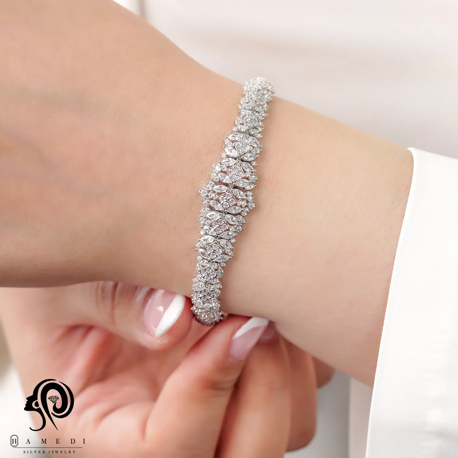 دستبند نقره زنانه مجلسی جواهری مدل BI K29 از ظریفترین و پرطرفدارترین دستبند های مجلسی گالری حامدی است.