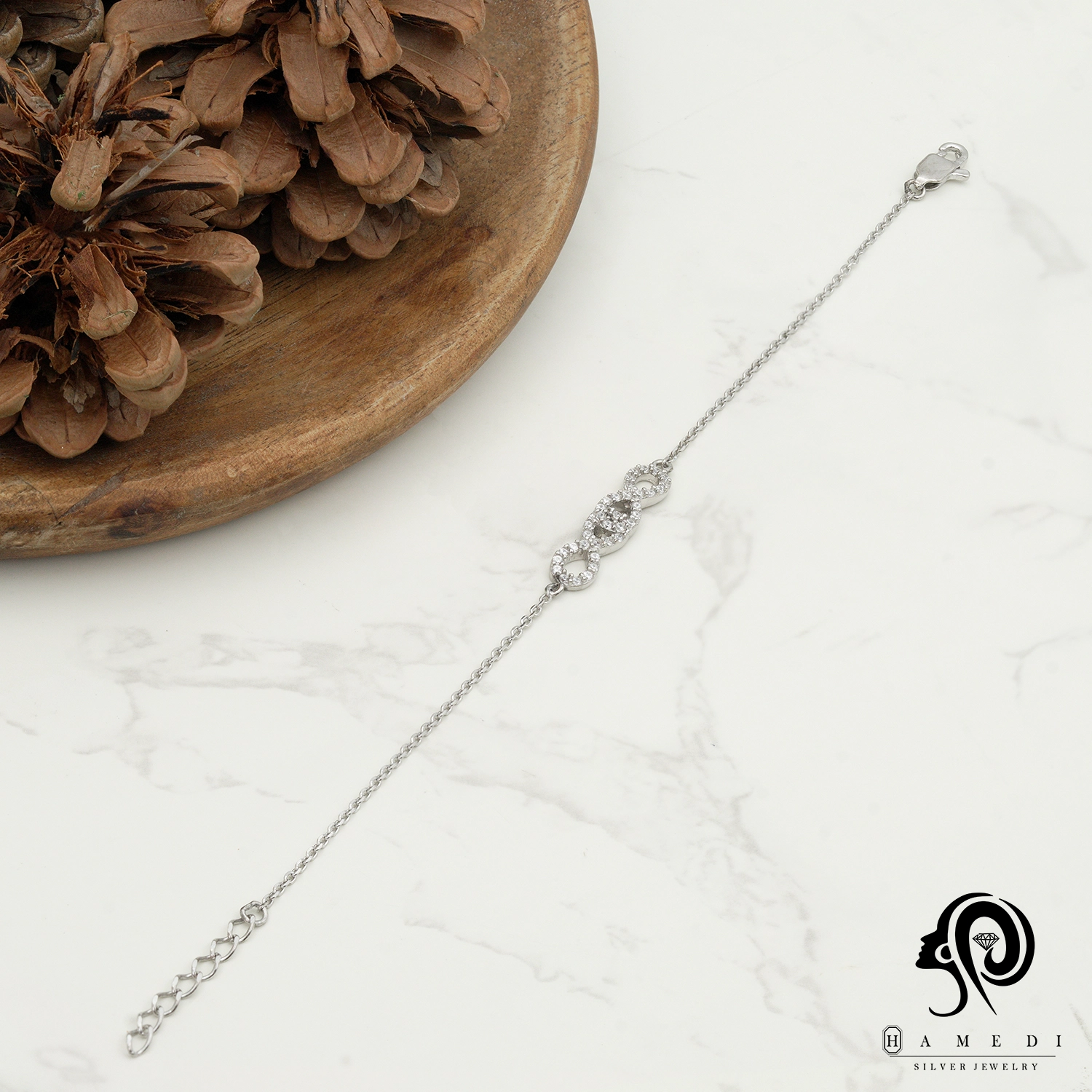دستبند نقره زنانه زنجیری بینهایت مدل BIC B117 به خاطر درخشش و رنگ خاصی که دارند، جلوه ای شیک و دلربا به دست ها می بخشند. علاوه بر زیبایی، کیفیت نقره نیز یکی از دلایل محبوبیت این دستبندها است.