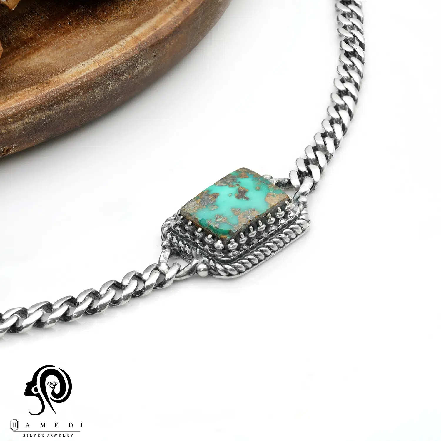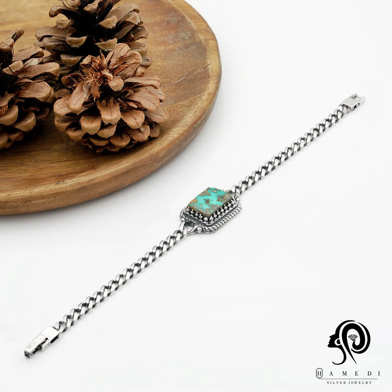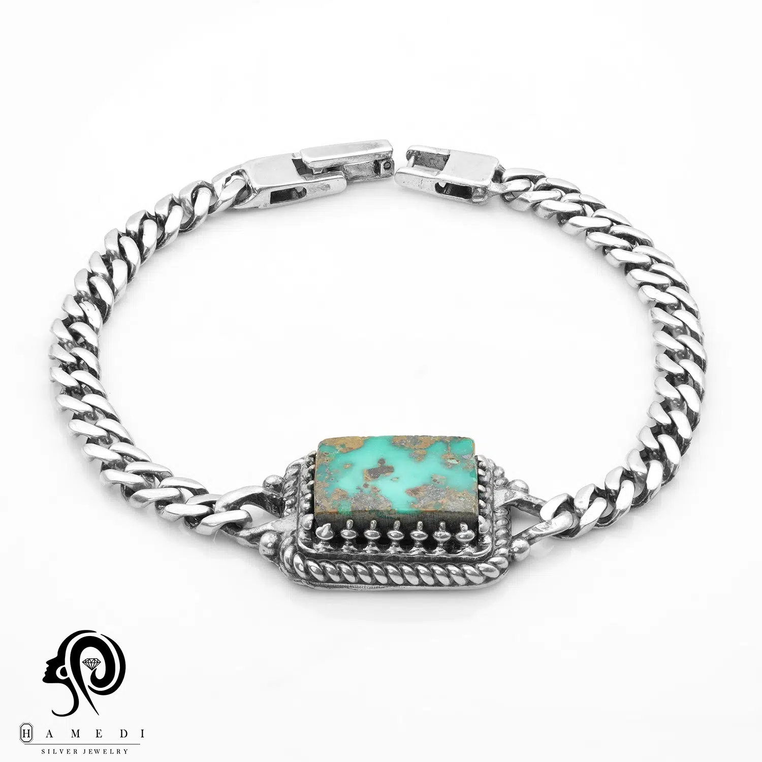 دستبند نقره مردانه سنگ فیروزه مدل BIM FI1 یکی از لوکسترین و پرطرفدارترین دستبند مردانه نقره حامدی است.