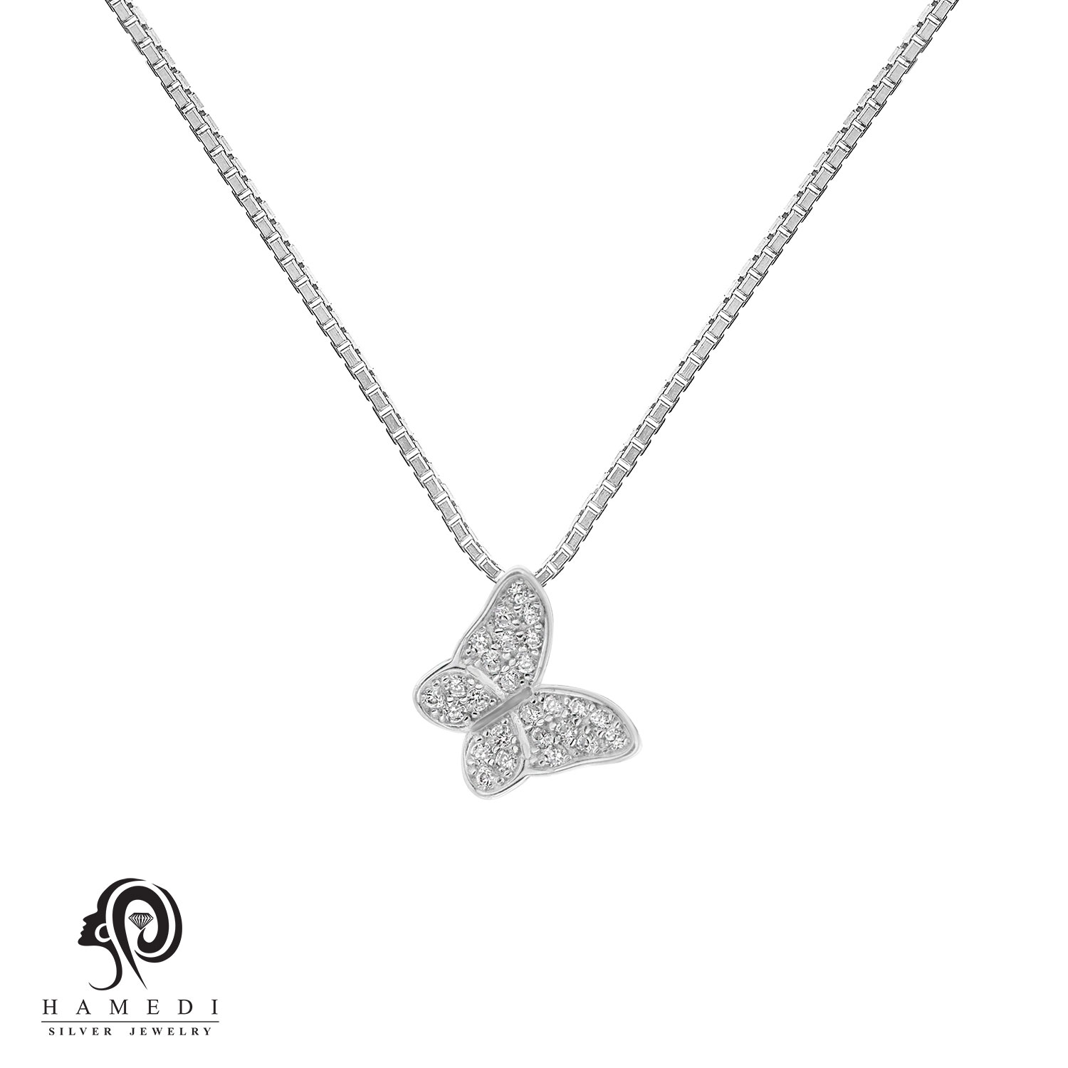 گردنبند نقره زنانه پروانه برلیان مدل ME B10 یکی از زیباترین و پرطرفدارترین گردنبند های شیک گالری حامدی است.