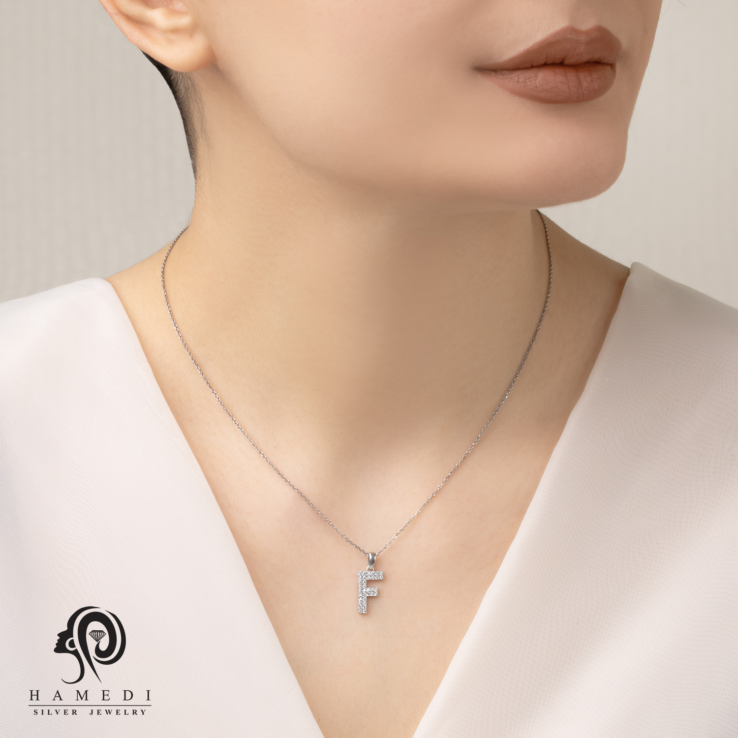 گردنبند نقره زنانه حرف F مدل MI B24 یکی از زیباترین و پرطرفدارترین گردنبند های حروفی گالری حامدی است.