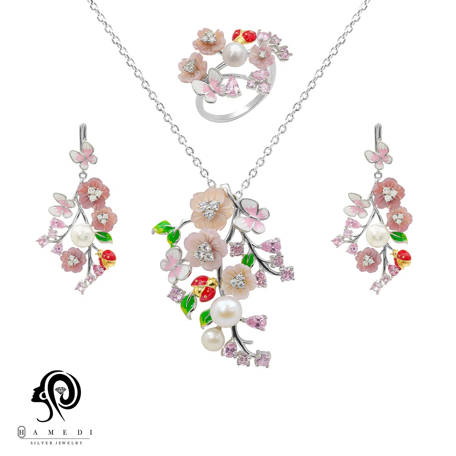 نیم ست صدفی نقره زنانه مدل NE C4 یکی از ست های شیک و زیبا نقره حامدی است.