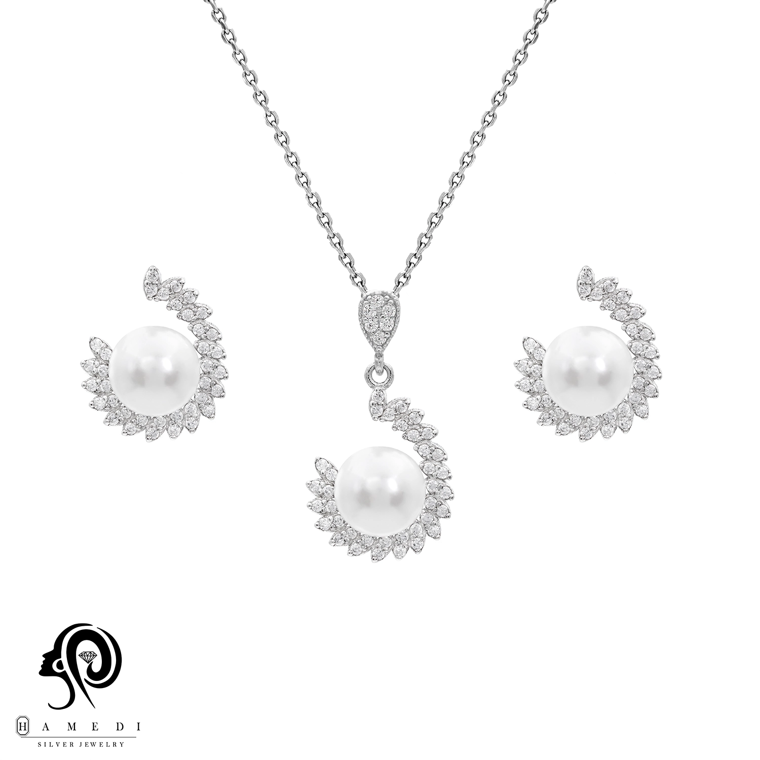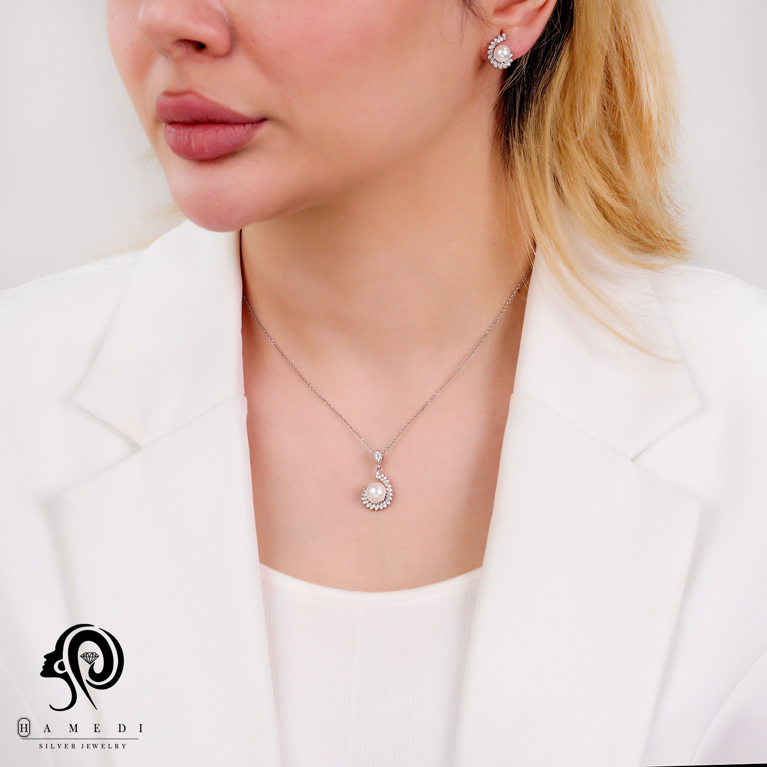 نیم ست نقره زنانه مروارید مجلسی مدل NI Y13 یکی از زیباترین و پرطرفدارترین نیم ست های مجلسی گالری حامدی است.