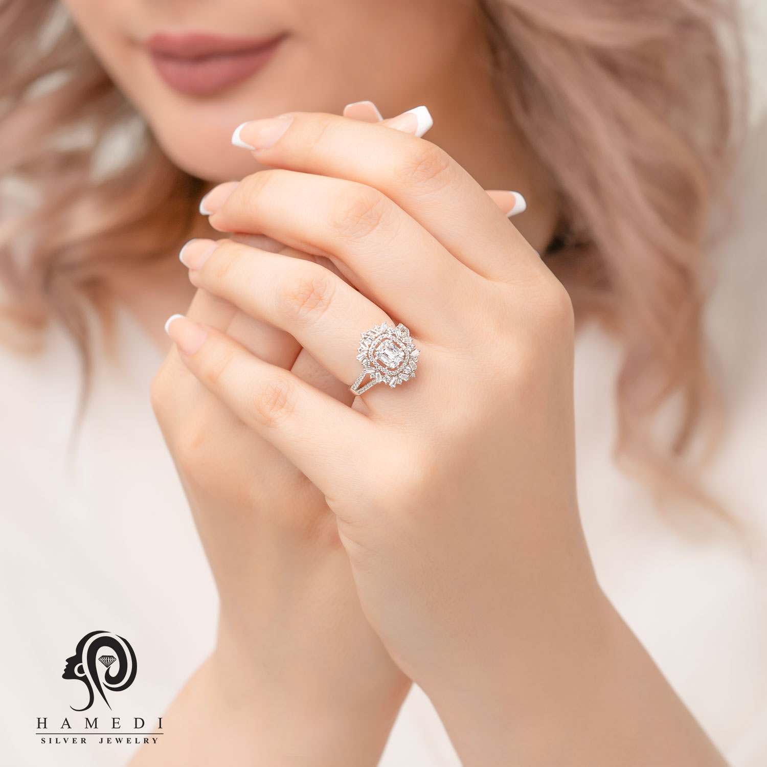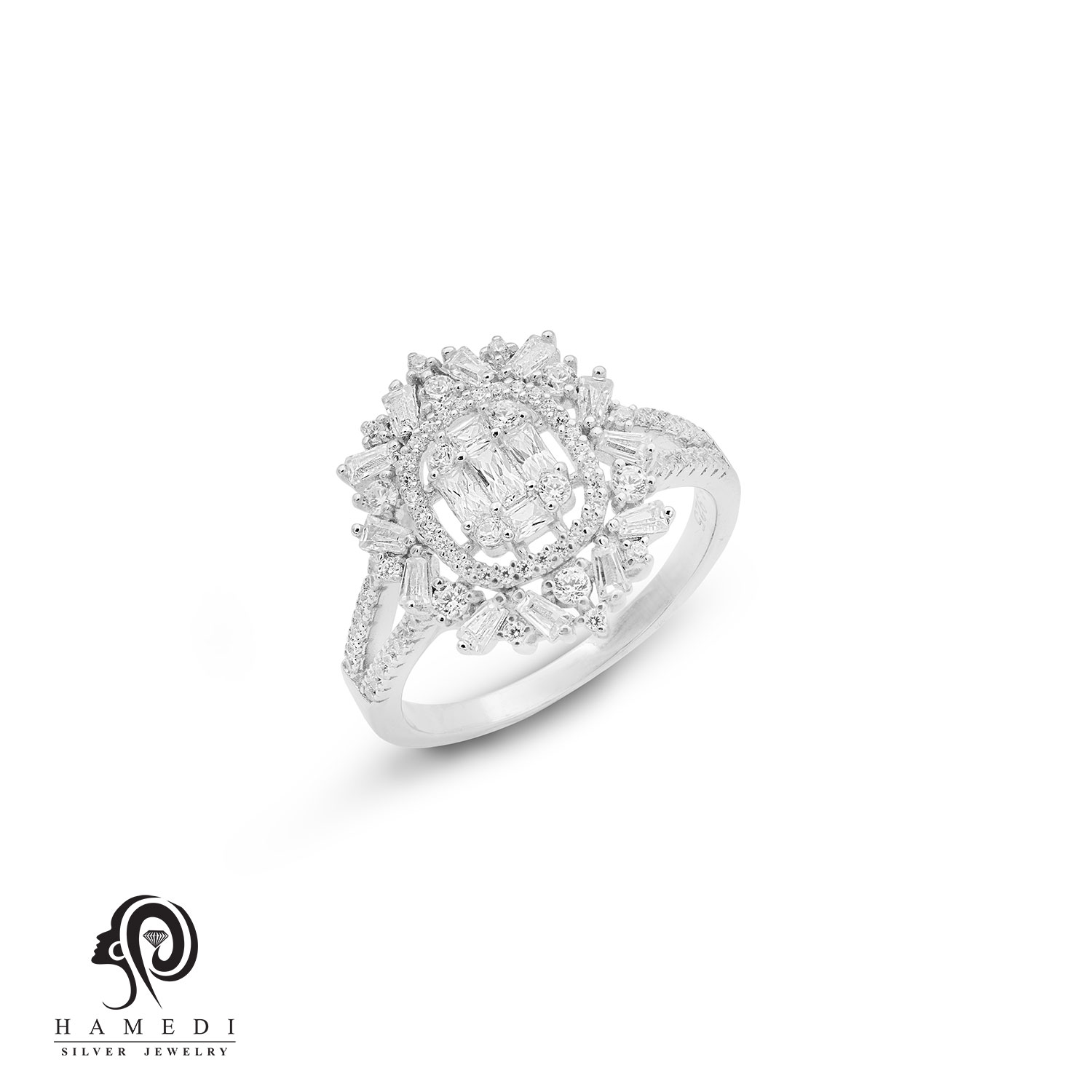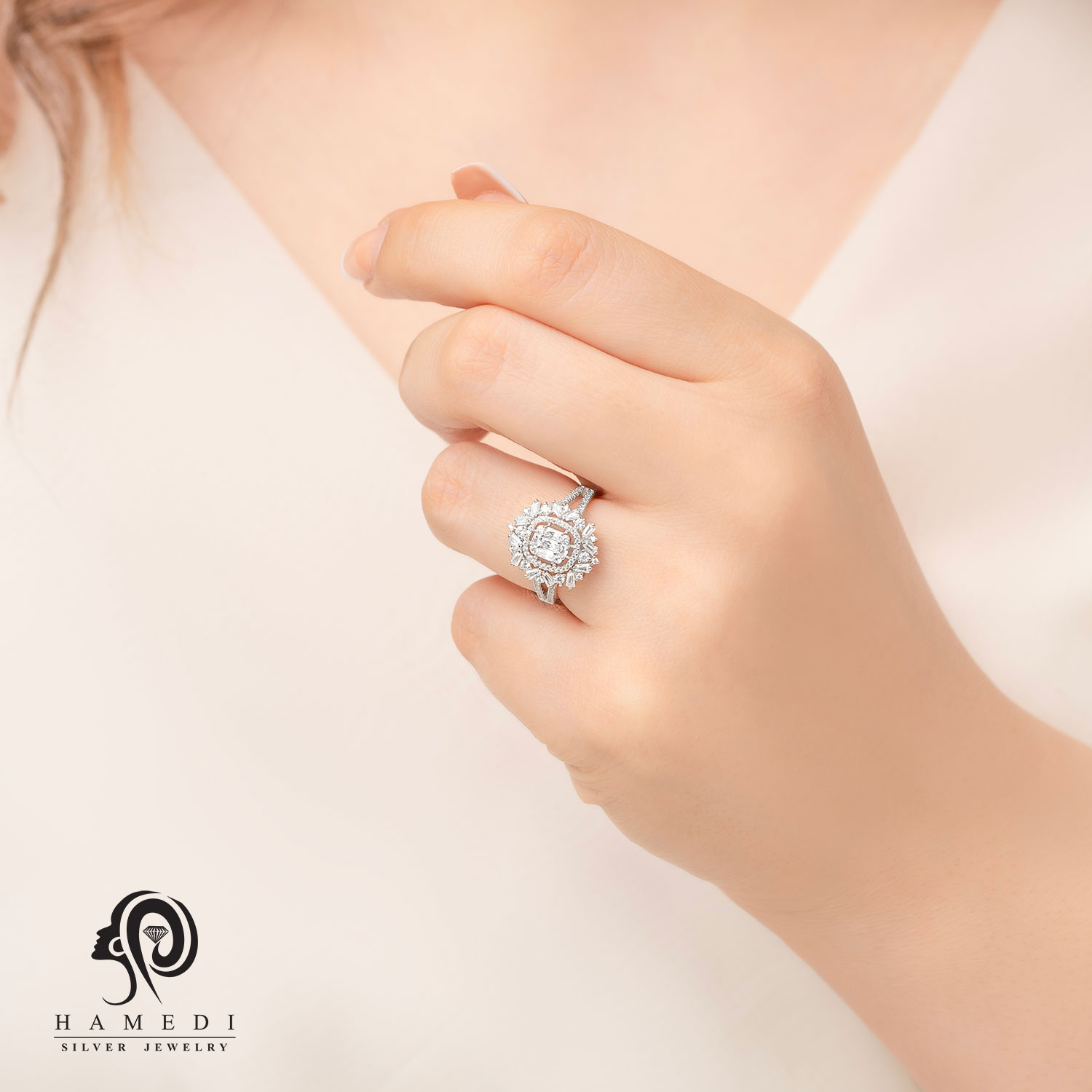انگشتر نقره زنانه جواهری مجلسی مدل RE S42 یکی از لوکس و زیباترین انگشترهای مجلسی گالری حامدی است.