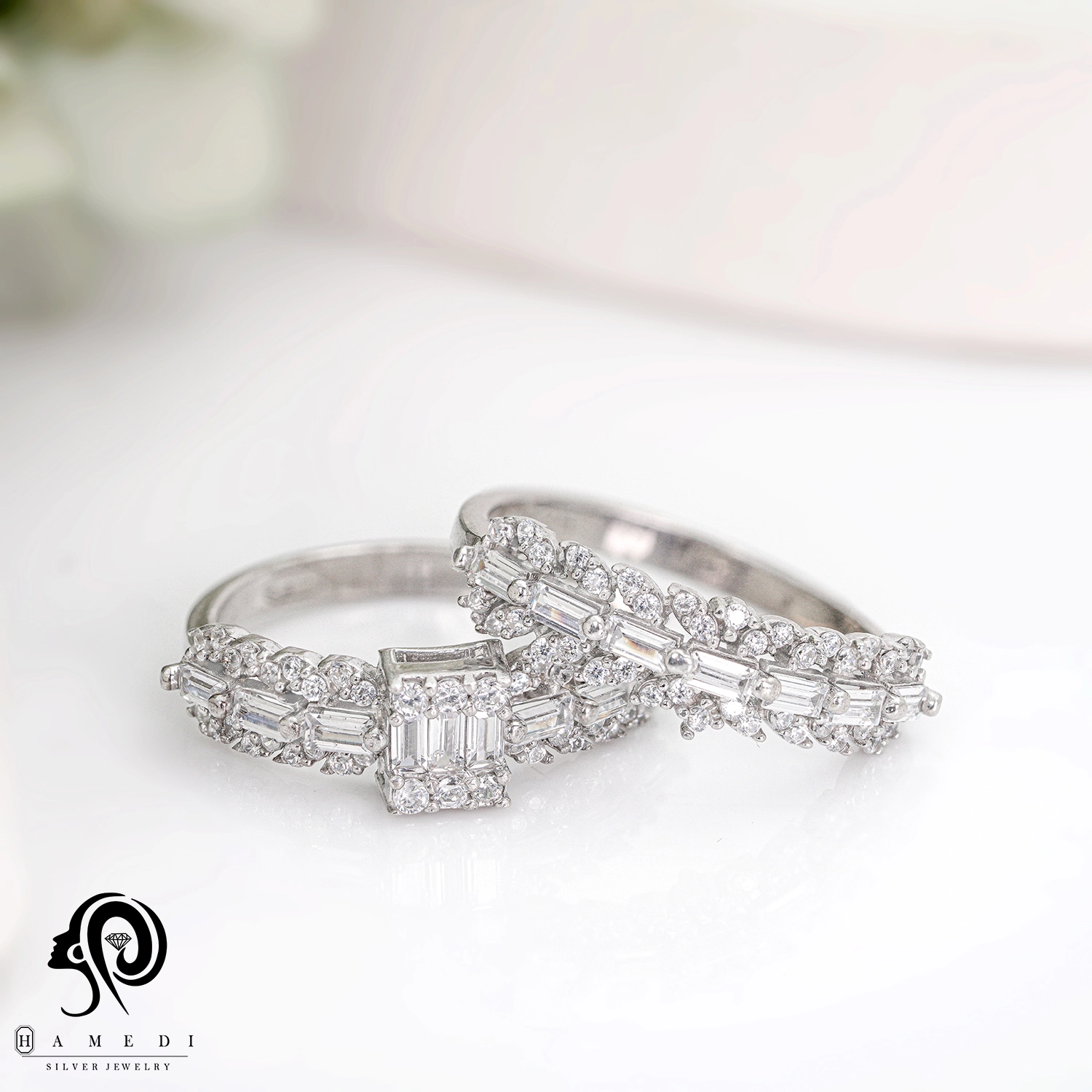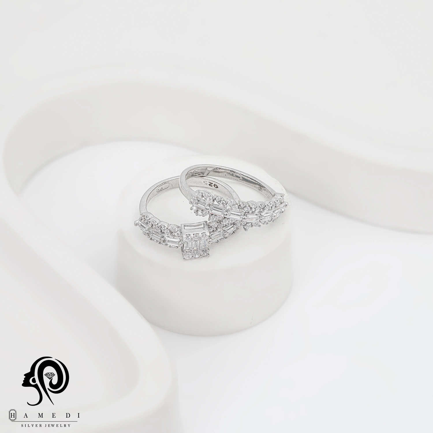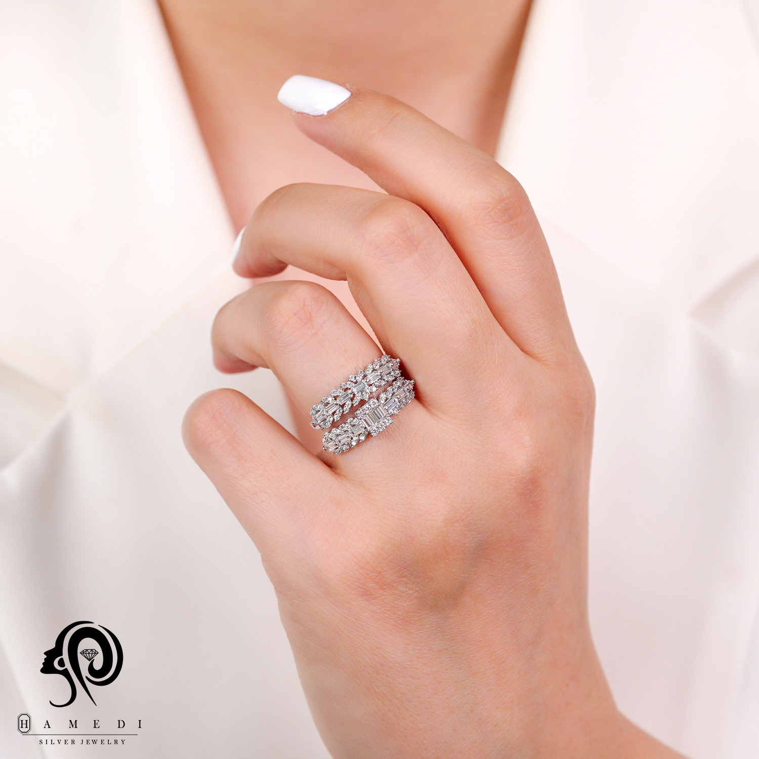انگشتر نقره زنانه حلقه پشت حلقه مدل RI E109 یکی از لوکس و زیباترین انگشترهای مجلسی گالری حامدی است.