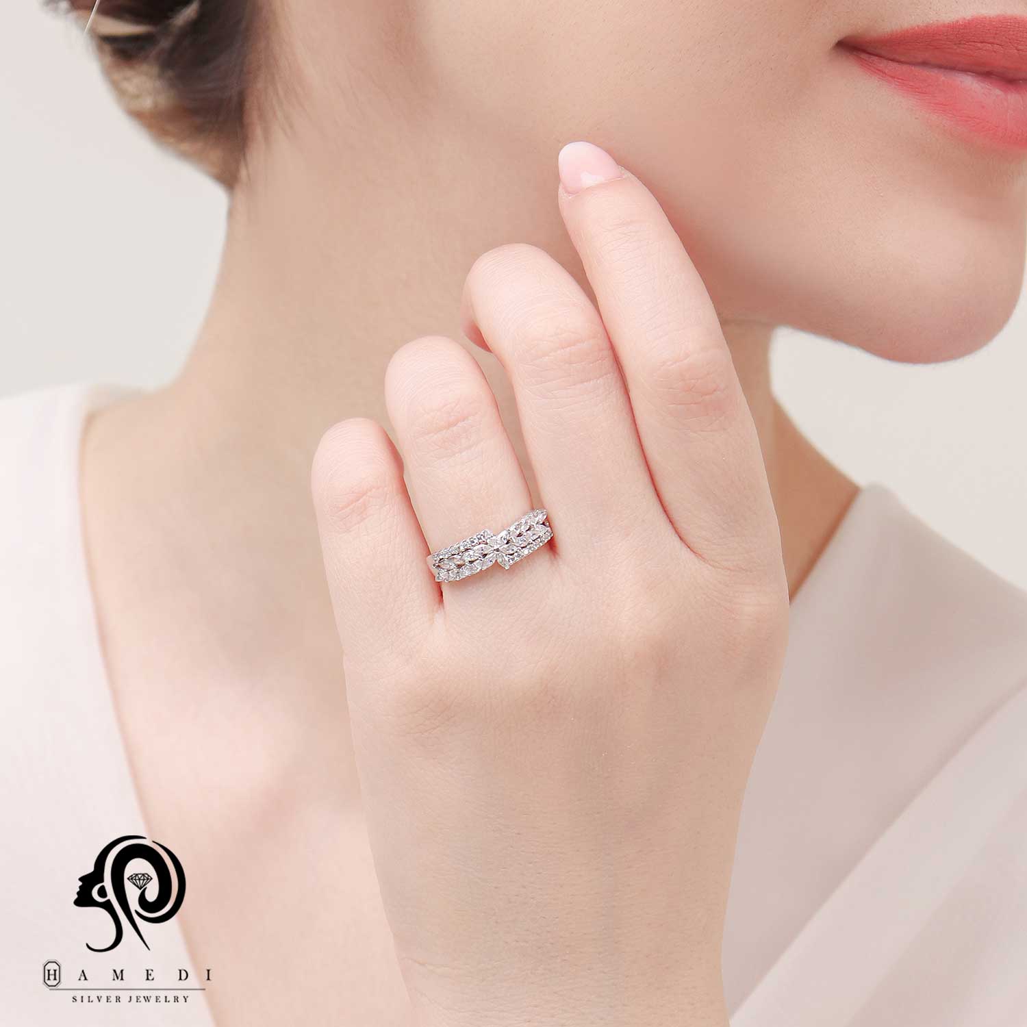 انگشتر زنانه نقره طرح گل مدل RI K43 یکی از لوکسترین و پرطرفدارترین انگشتر های مجلسی گالری حامدی است.