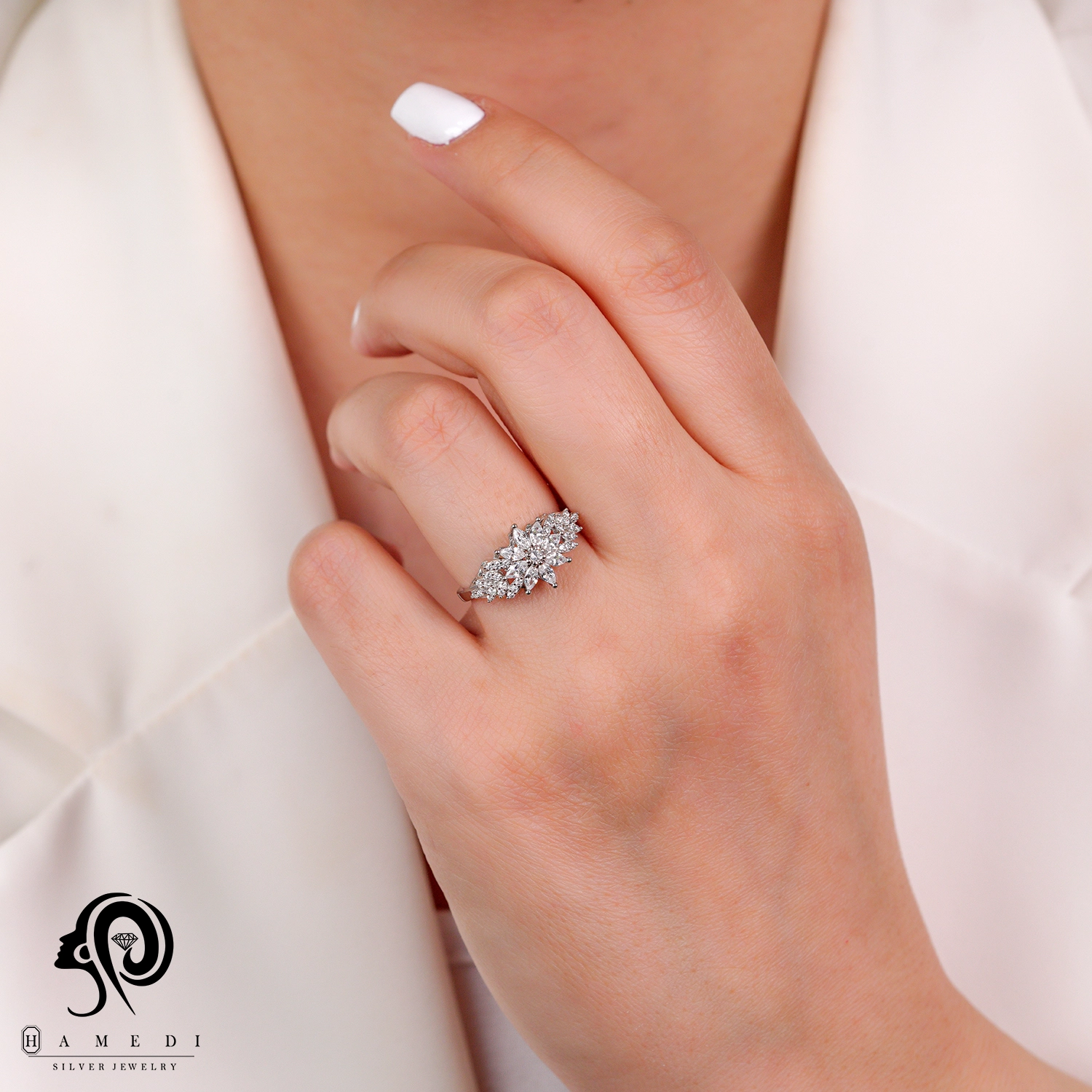 انگشتر نقره زنانه مجلسی جواهری مدل RI K79 یک اکسسوری زیبا و شیک است که در انواع طرح های مختلف تولید و عرضه می شود. این محصول دارای طرحی منحصر به فرد و خاصی می باشند تا مشتریان بتوانند به راحتی طرح مورد نظر خود را خریداری نمایند.