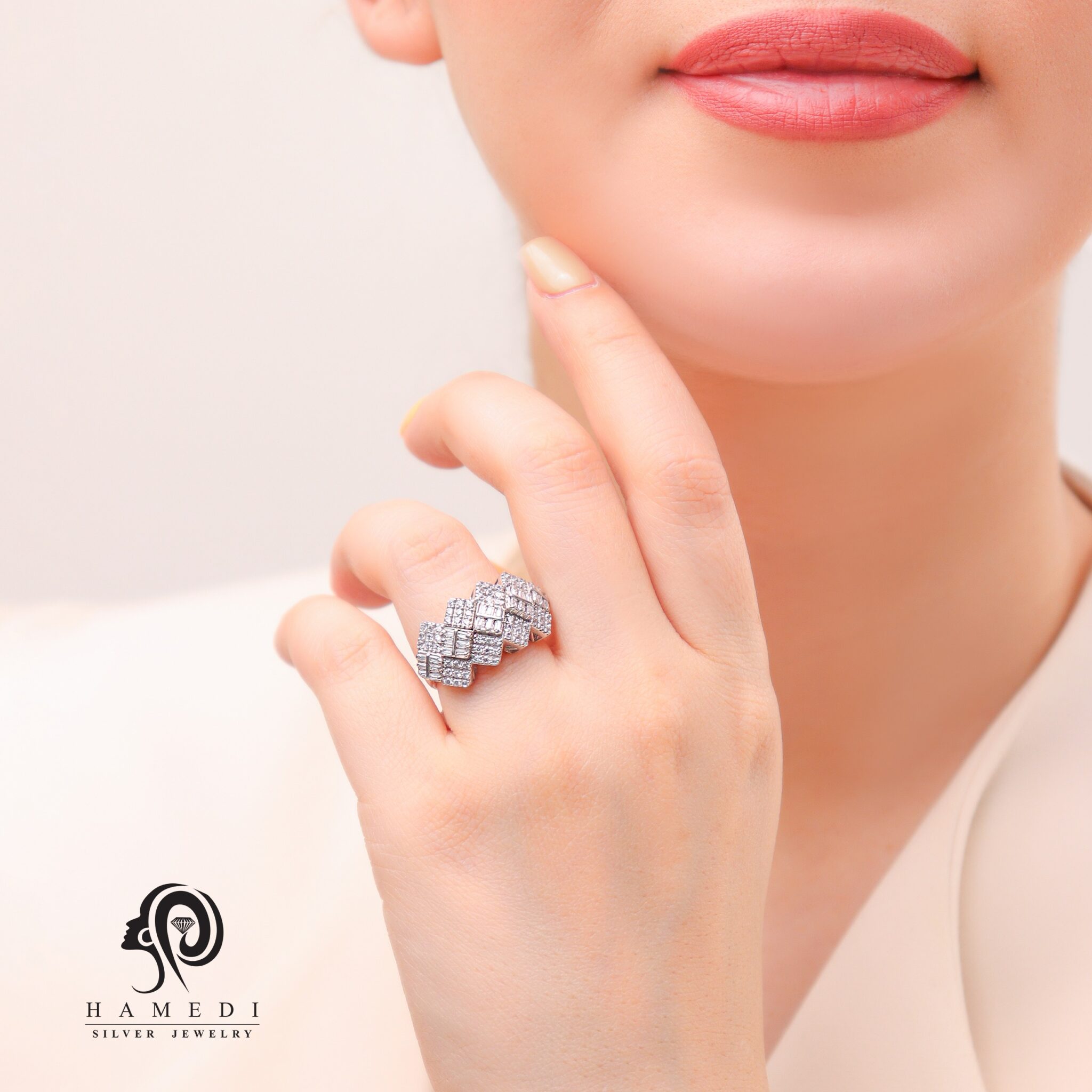 انگشتر نقره زنانه مجلسی لوکس مدل RIL E25 یکی از لوکس ترین و پرطرفدارترین انگشتر های مجلسی گالری حامدی است.