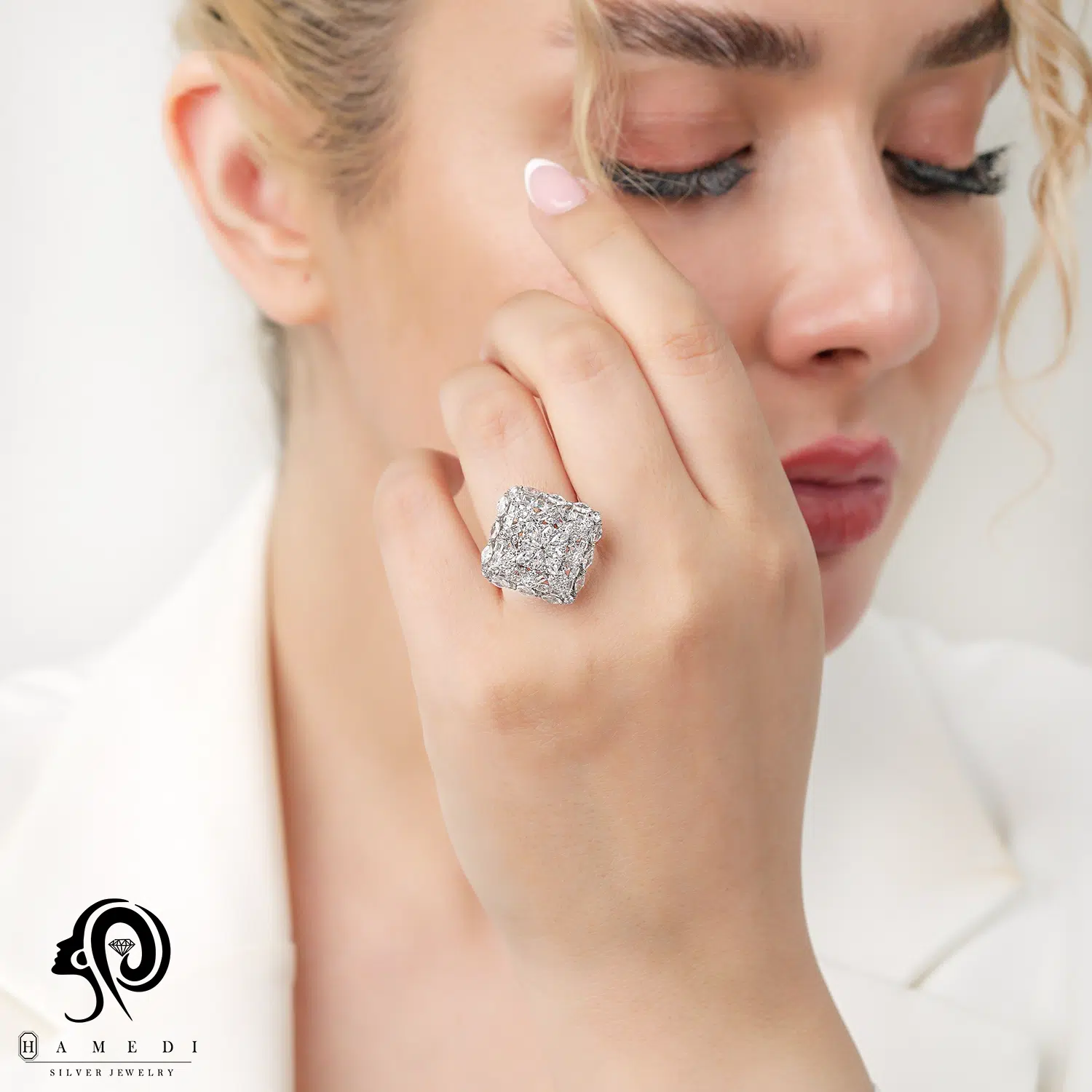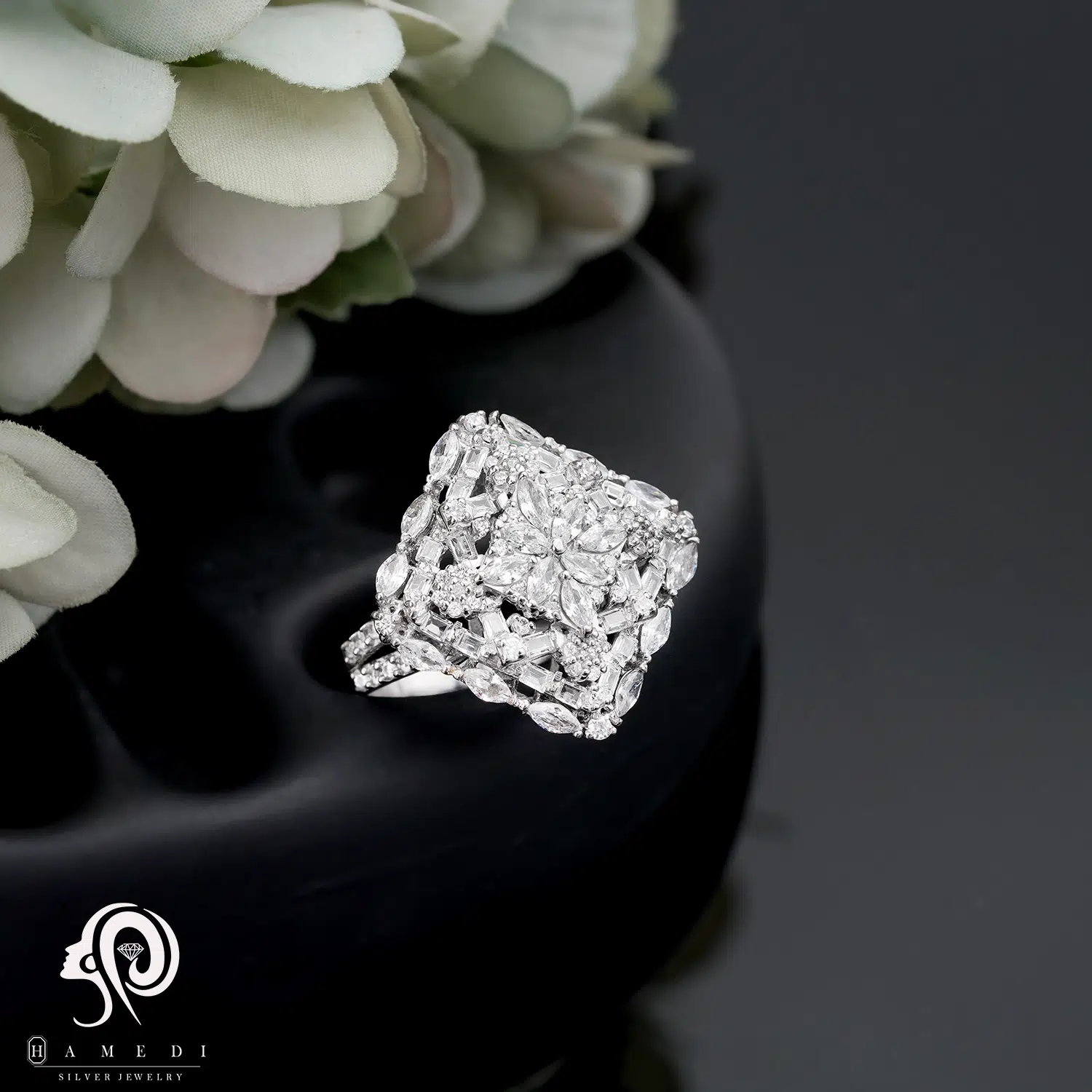 انگشتر نقره زنانه مجلسی جواهری مدل RIL F16 یک اکسسوری زیبا و شیک است که در انواع طرح های مختلف تولید و عرضه می شود. این محصول دارای طرحی منحصر به فرد و خاصی می باشند تا مشتریان بتوانند به راحتی طرح مورد نظر خود را خریداری نمایند.