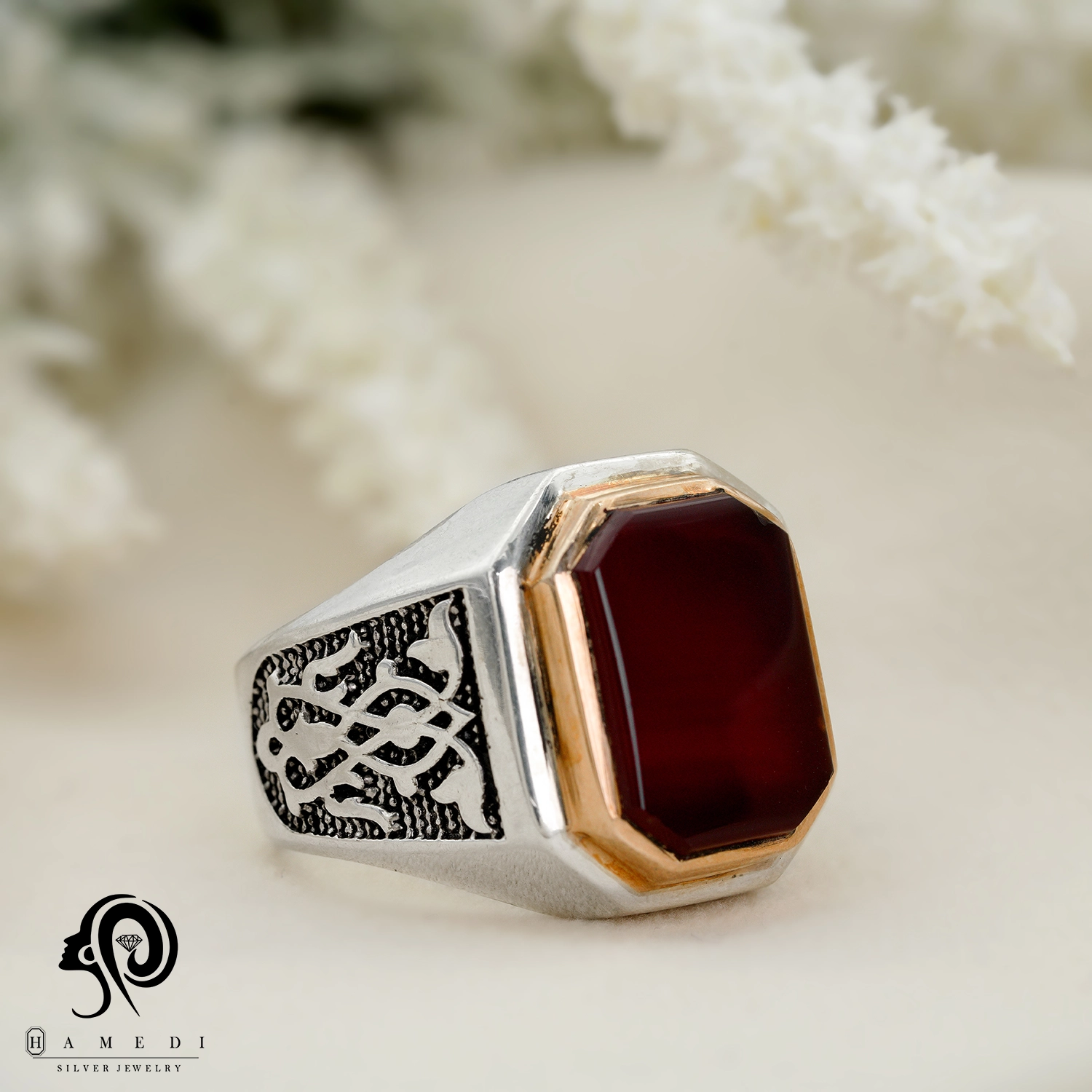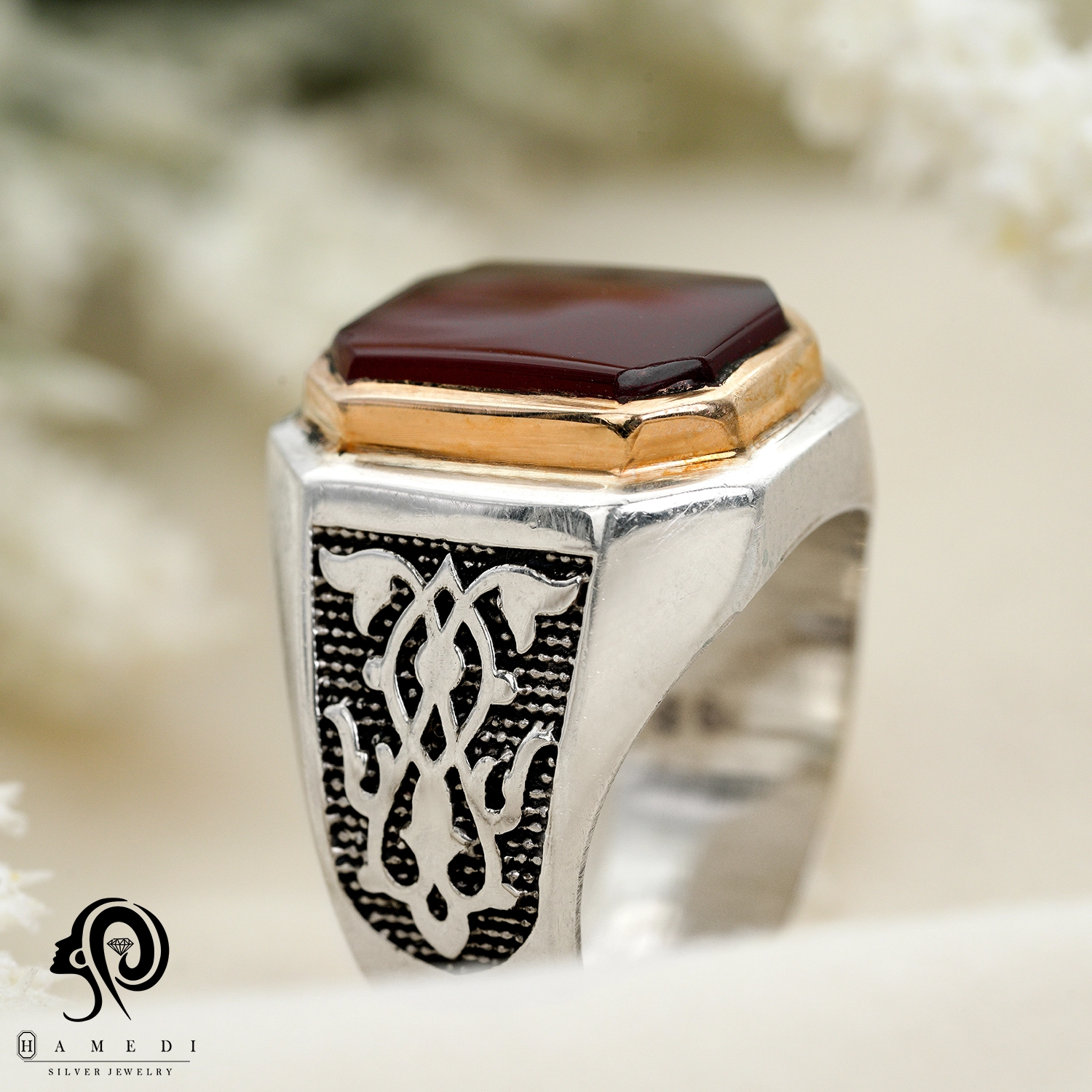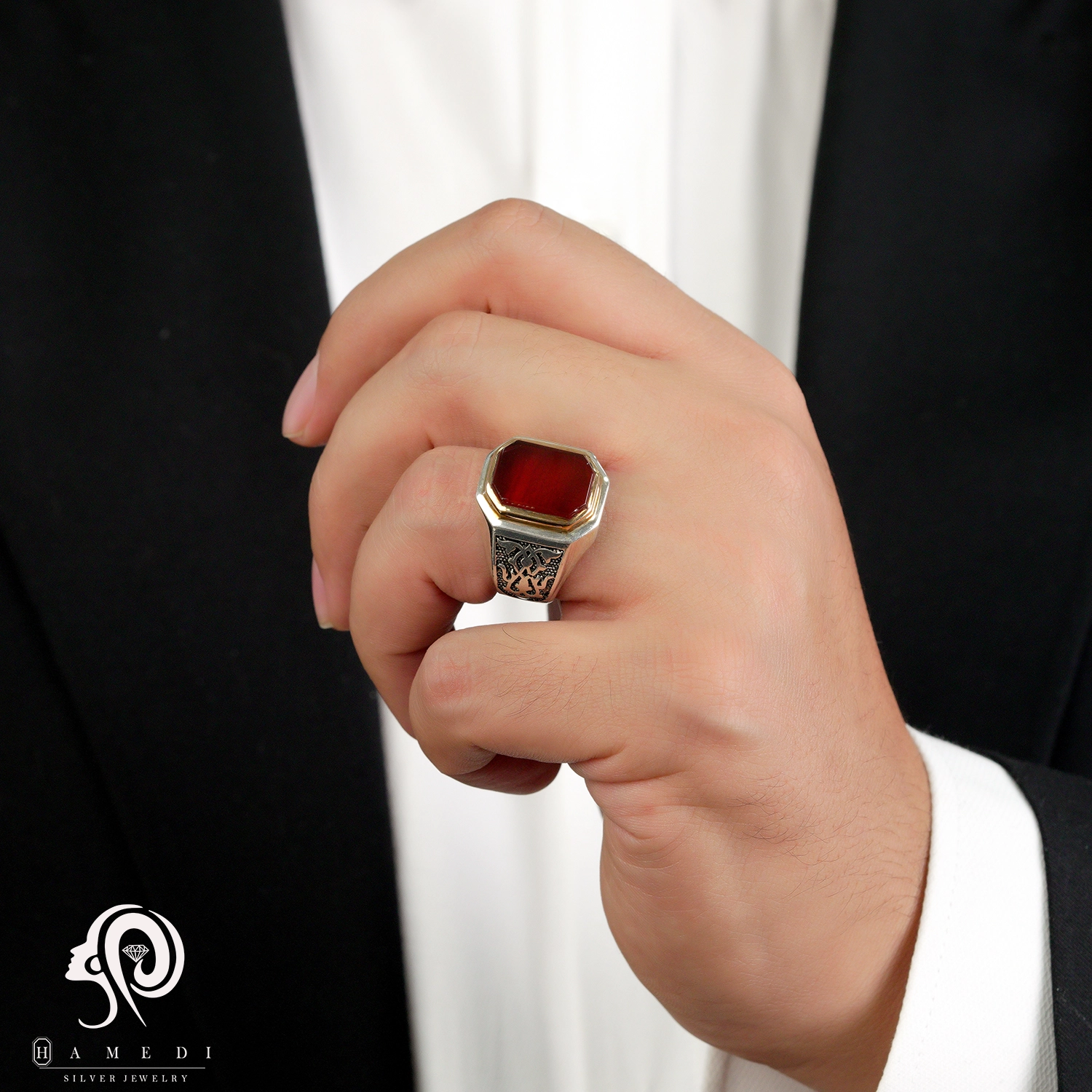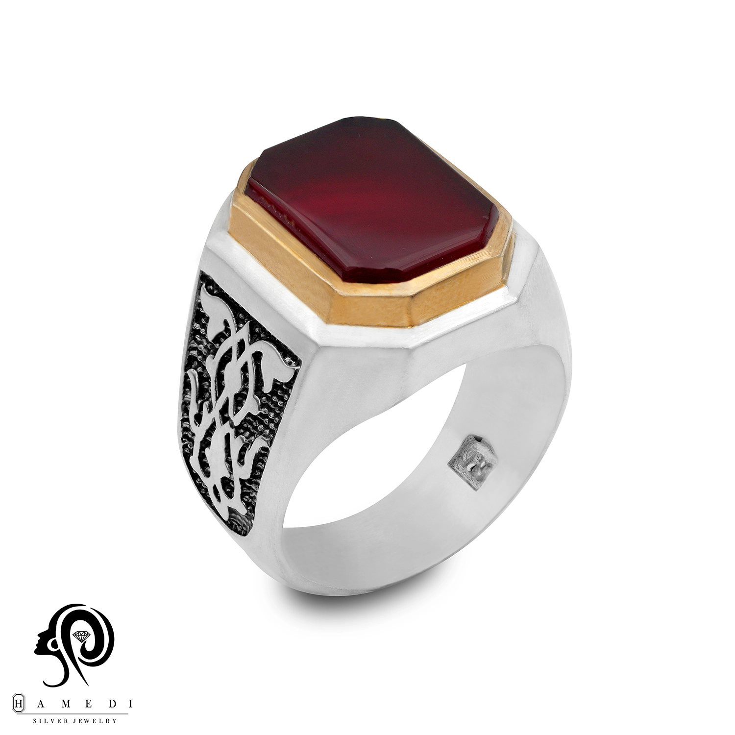 انگشتر عقیق مردانه قرمز نقره مدل RIM AG41 یکی از لوکسترین و پرطرفدارترین انگشتر های عقیق گالری حامدی است.