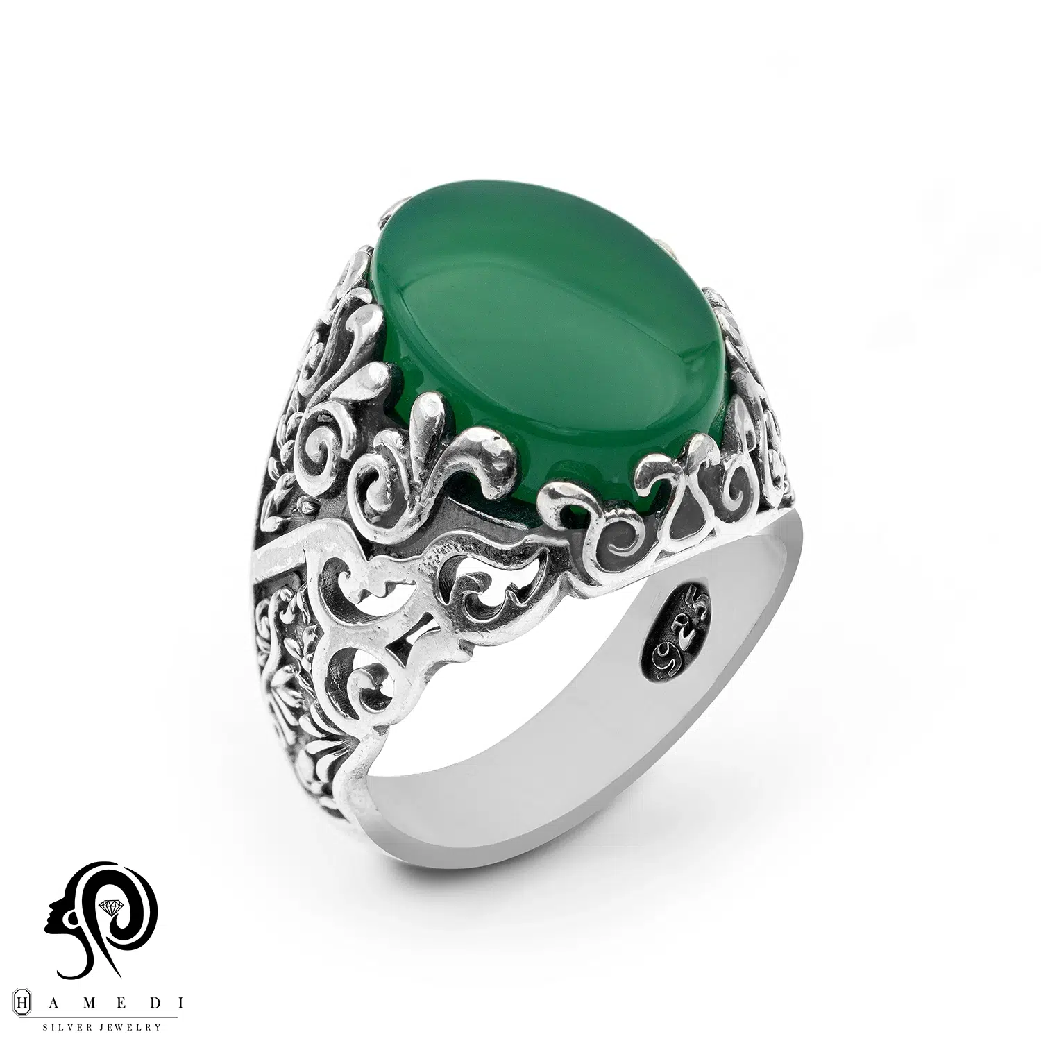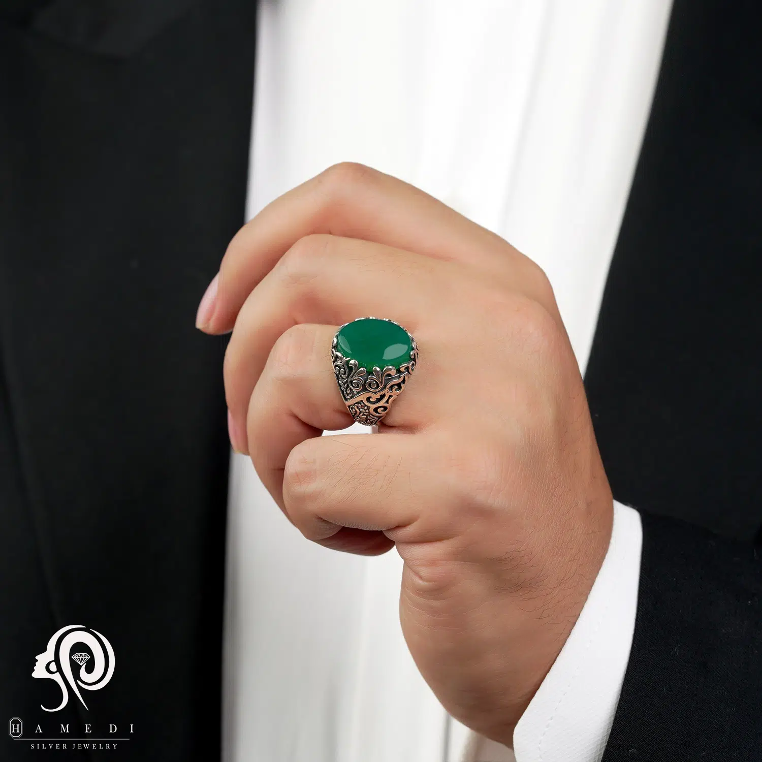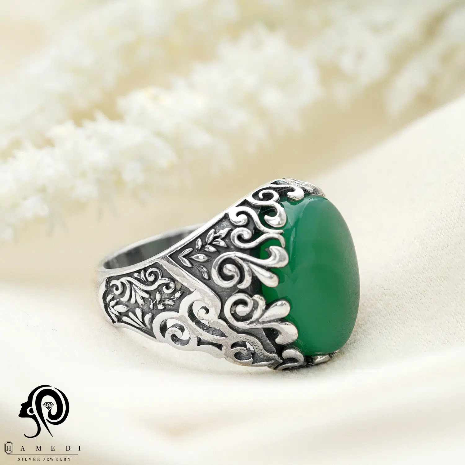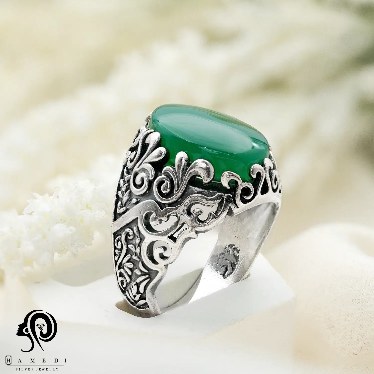 انگشتر نقره مردانه عقیق سبز مدل RIM AS10 یکی از لوکسترین و پرطرفدارترین انگشتر های عقیق گالری حامدی است.