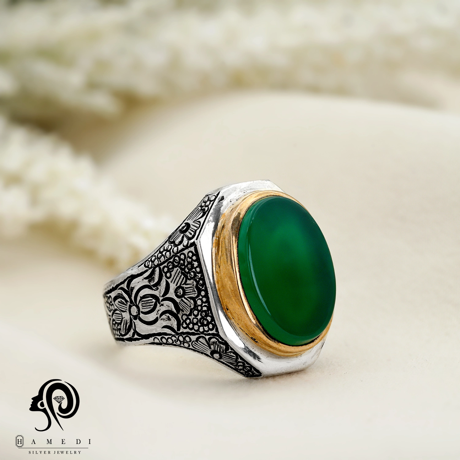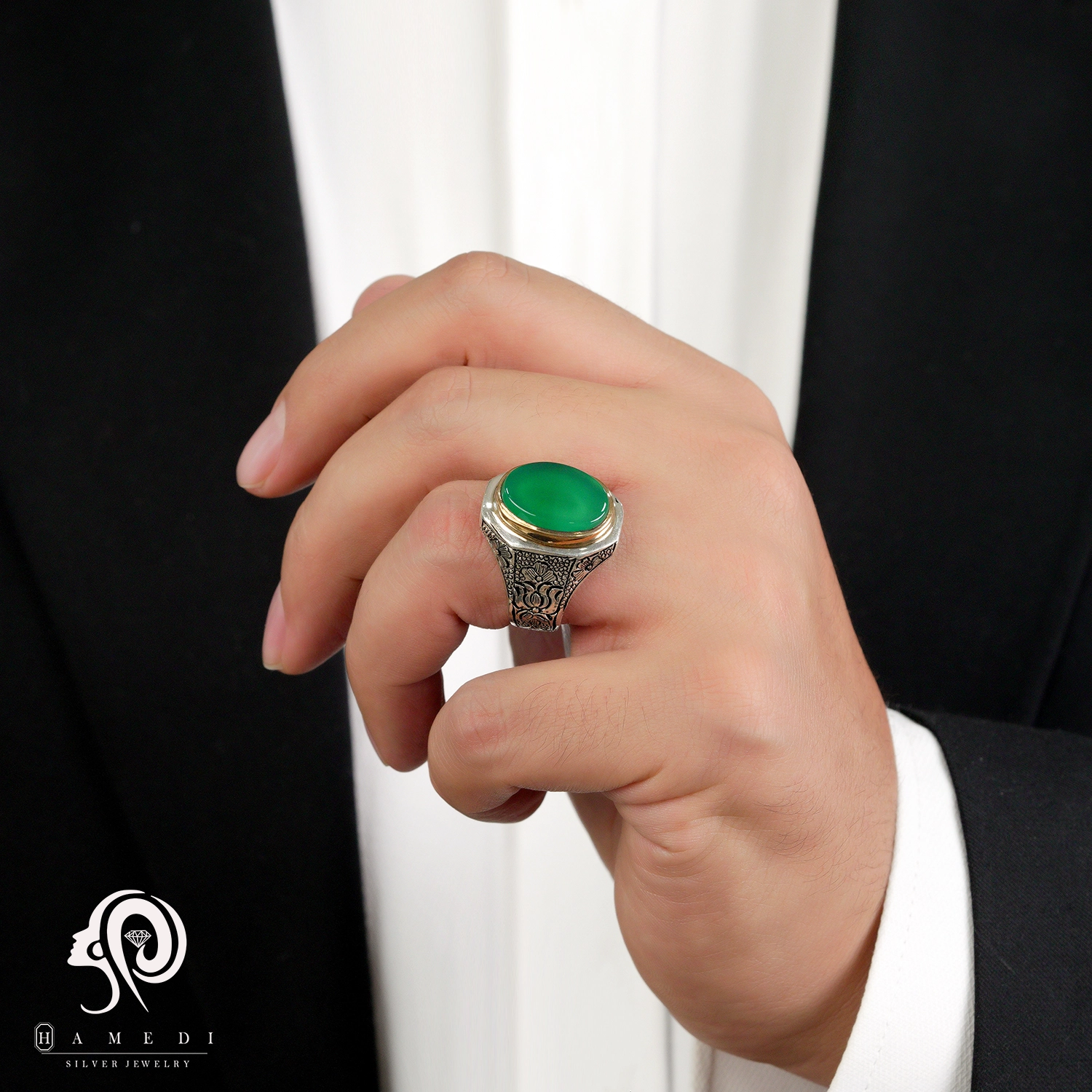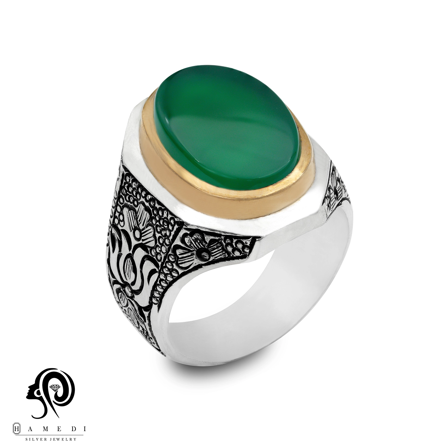 انگشتر نقره مردانه عقیق سبز مدل RIM AS15 یکی از لوکسترین و پرطرفدارترین انگشتر های عقیق گالری حامدی است.
