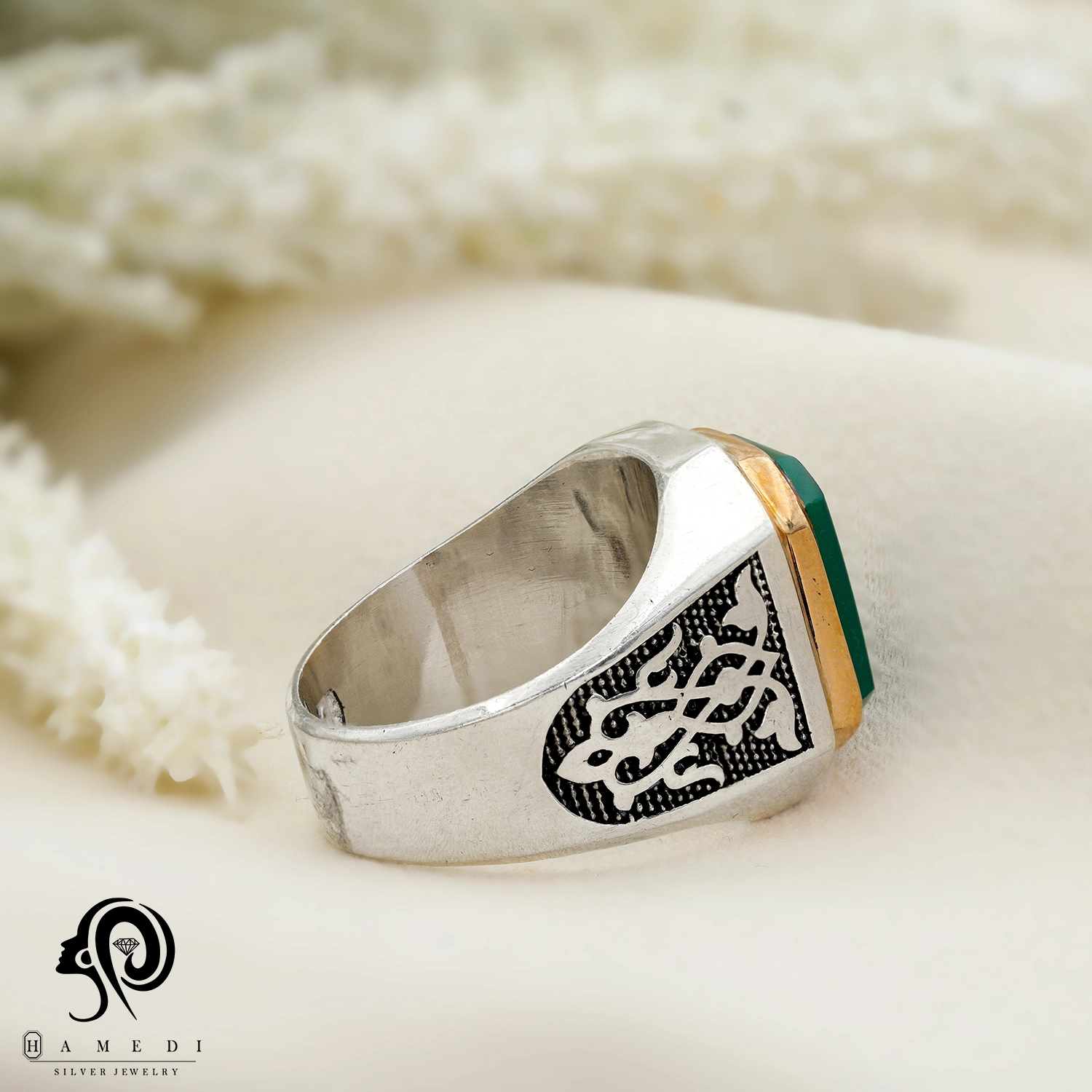 انگشتر نقره مردانه عقیق سبز مدل RIM AS16 یکی از لوکسترین و پرطرفدارترین انگشتر های عقیق گالری حامدی است.