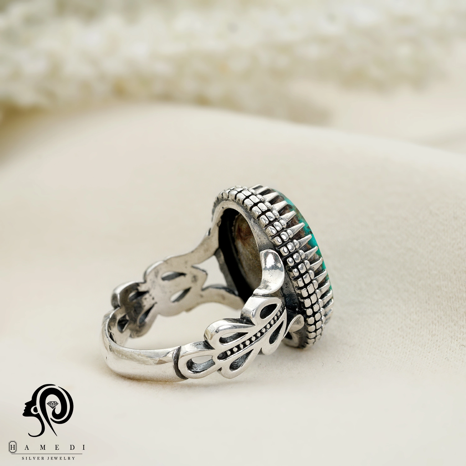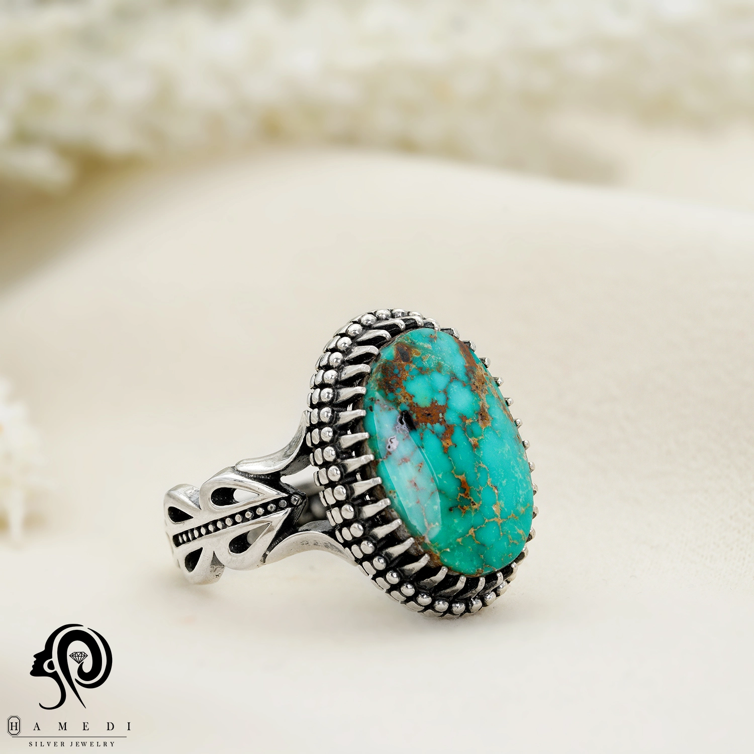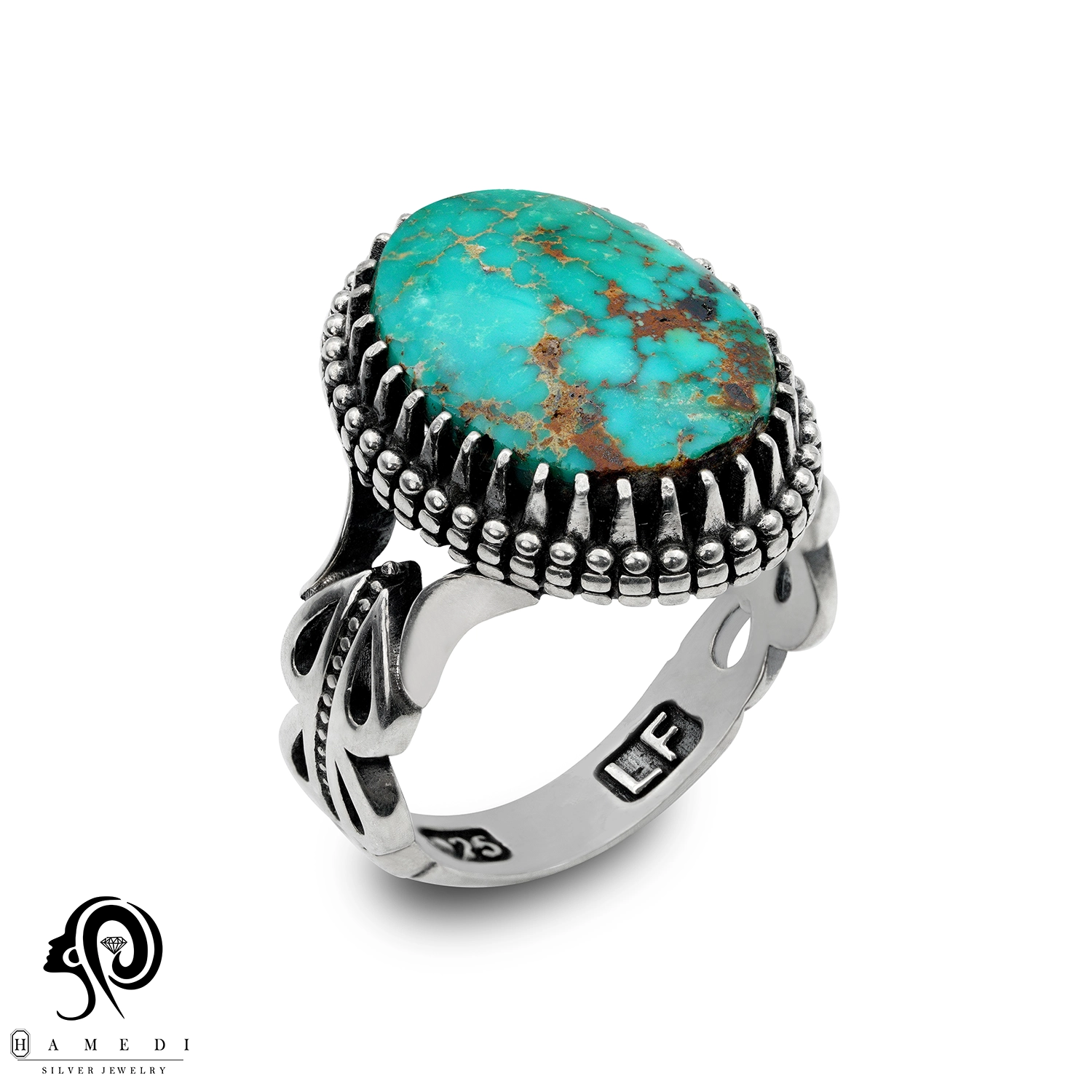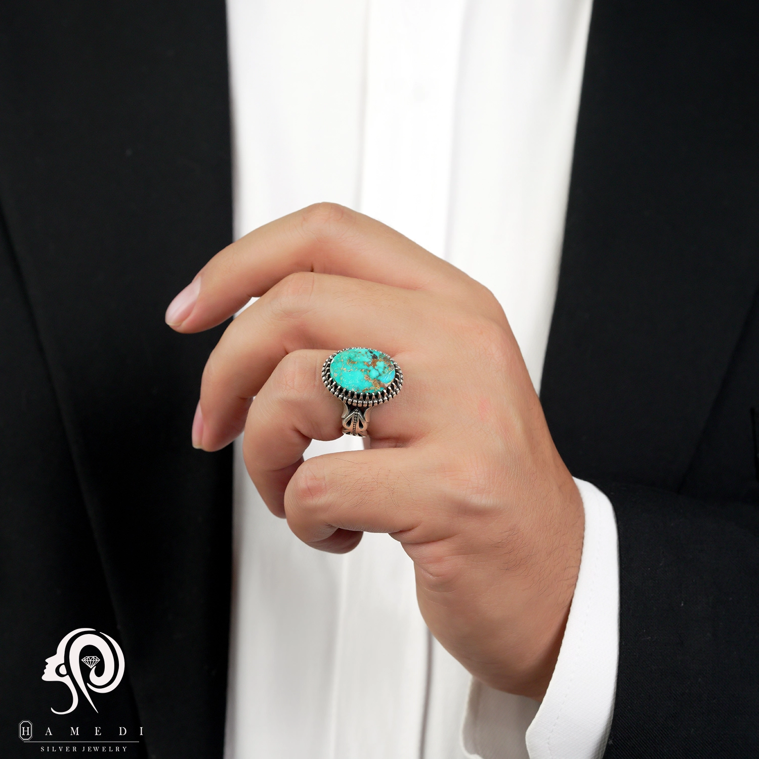 انگشتر فیروزه اصل نقره مردانه مدل RIM FI27 یکی از لوکسترین و پرطرفدارترین انگشتر های فیروزه گالری حامدی است.