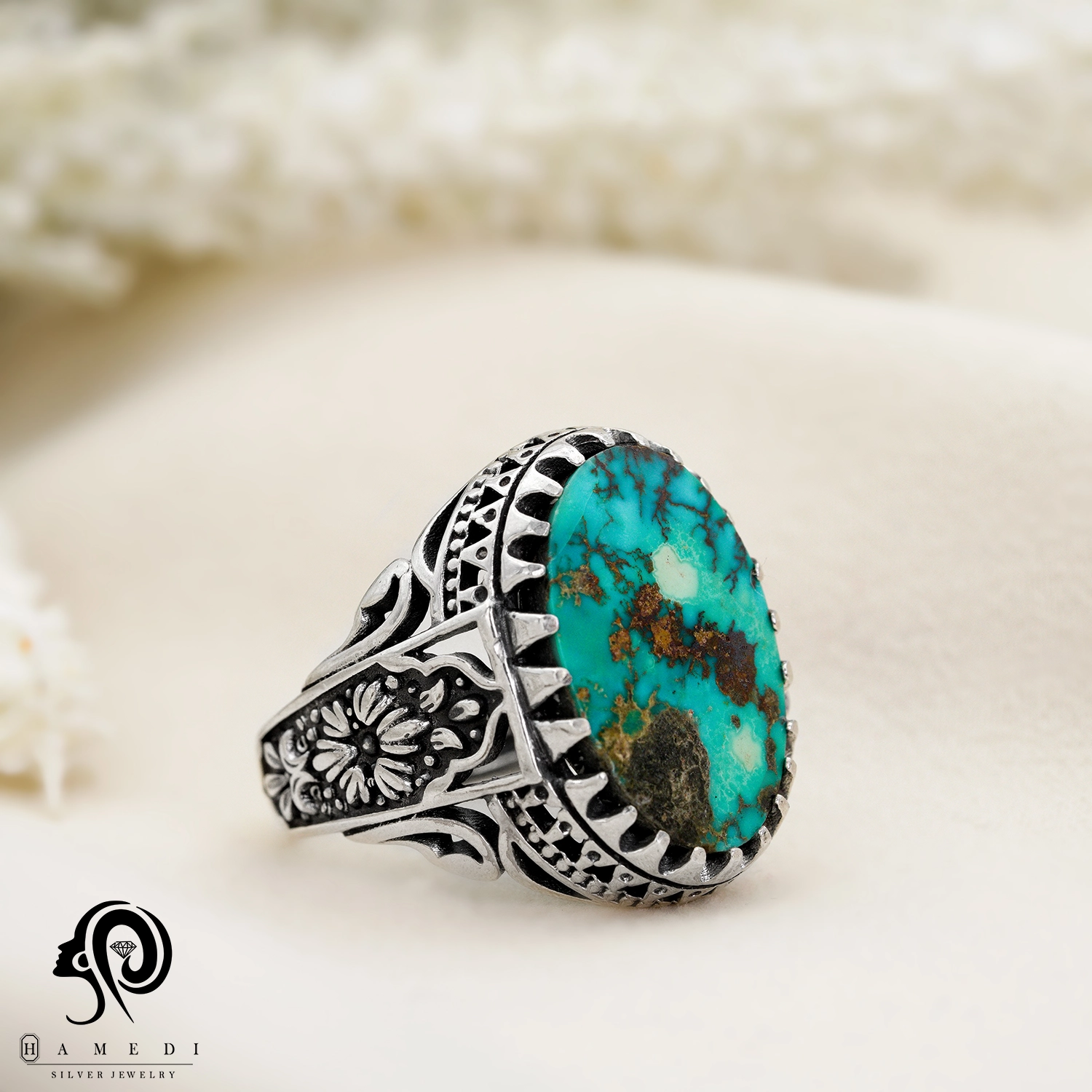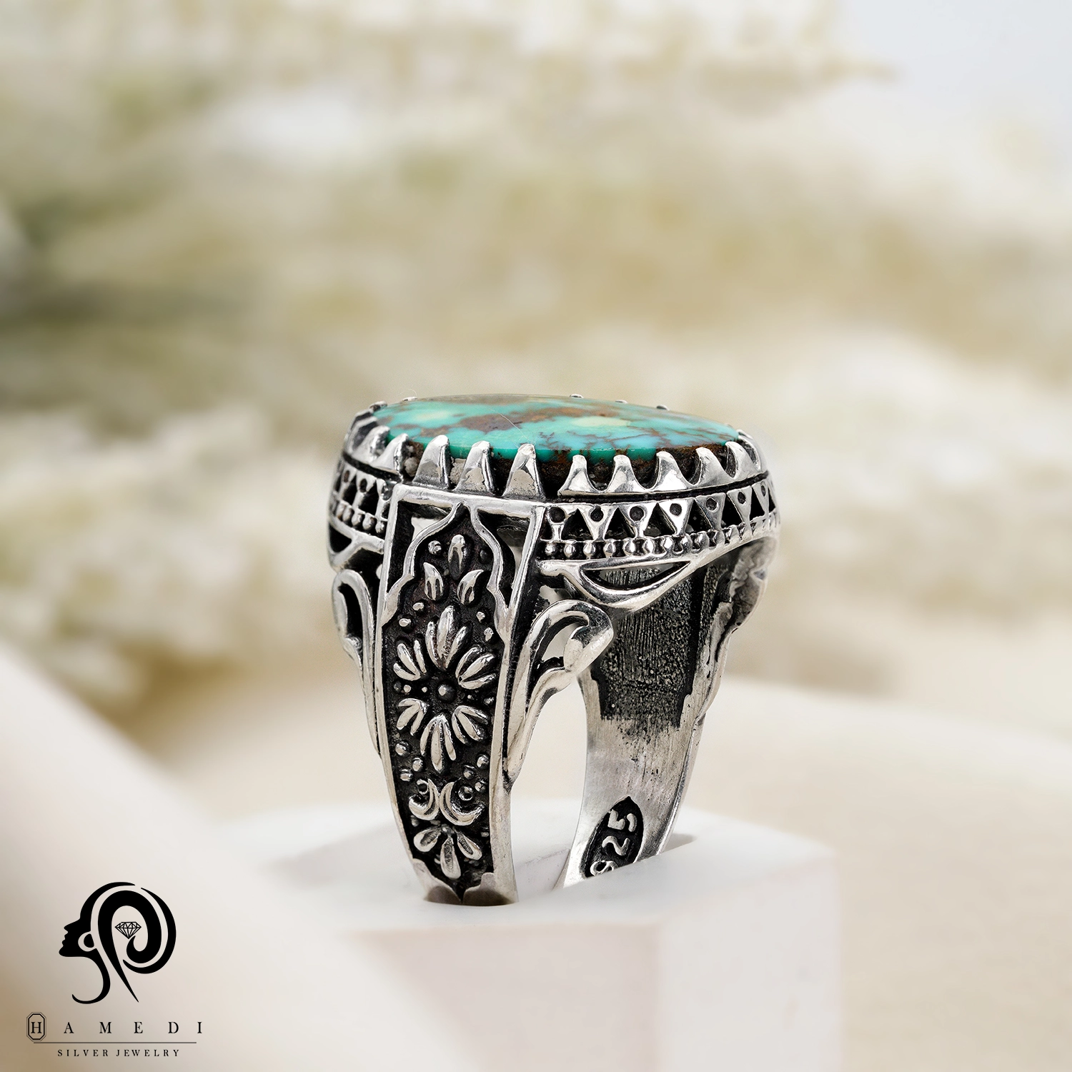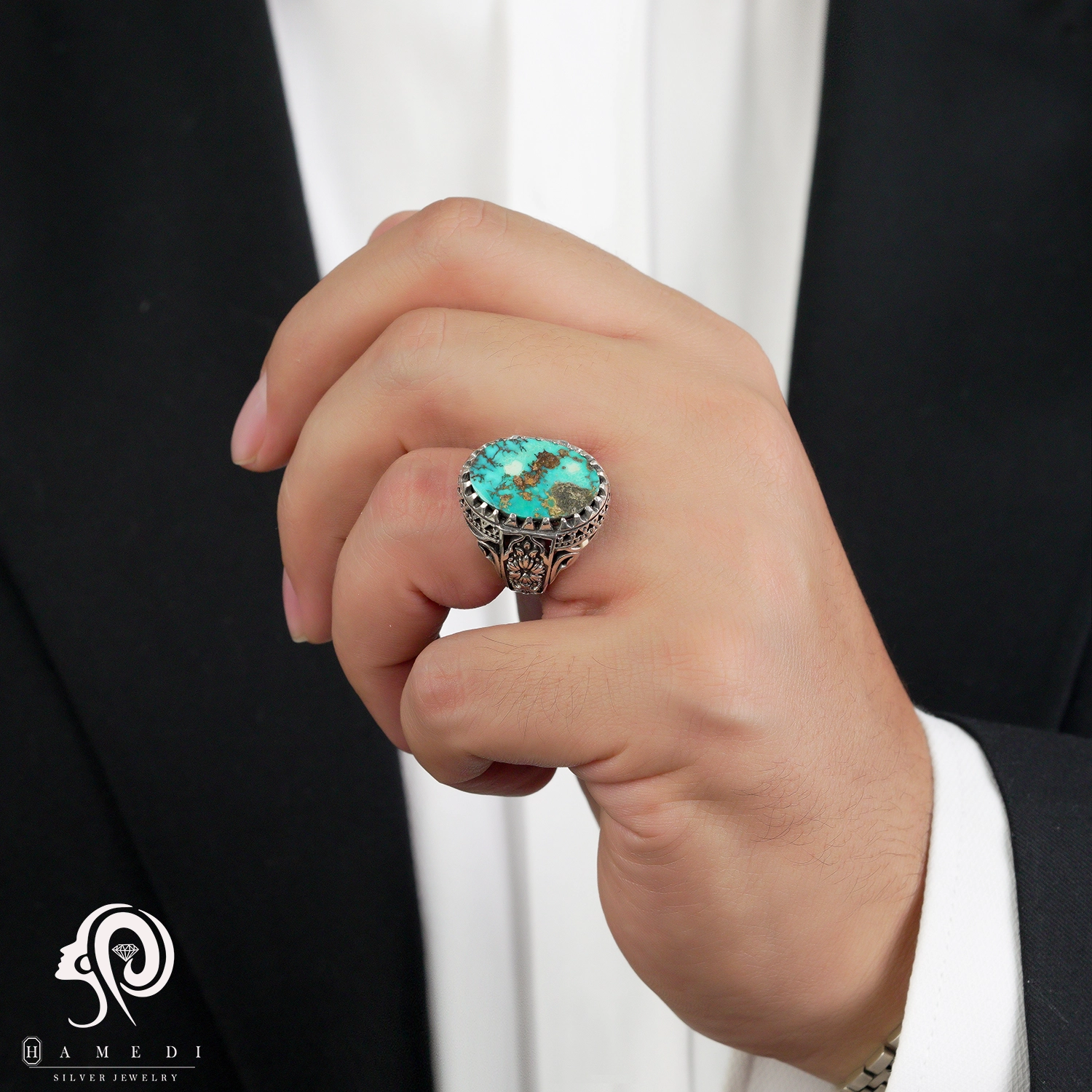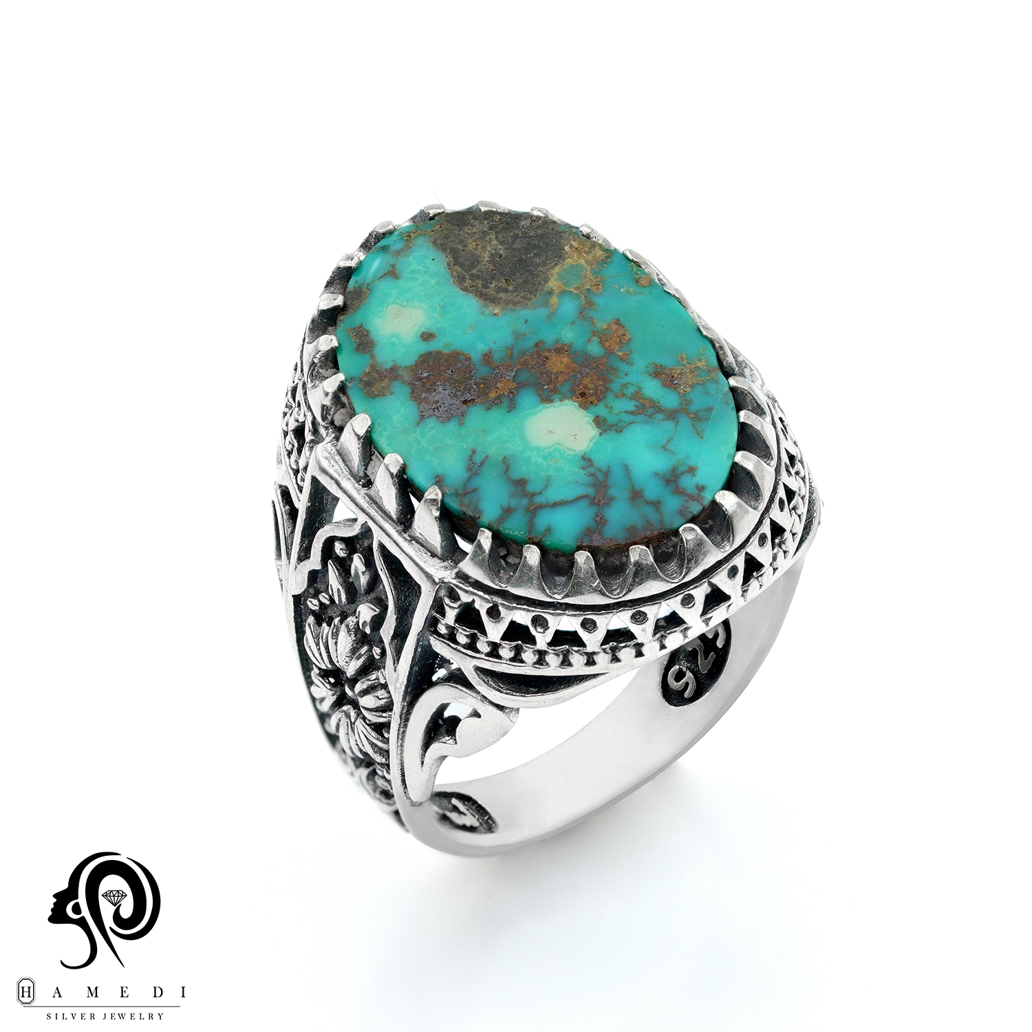 انگشتر فیروزه اصل نقره مردانه مدل RIM FI32 یکی از لوکسترین و پرطرفدارترین انگشتر های فیروزه گالری حامدی است.