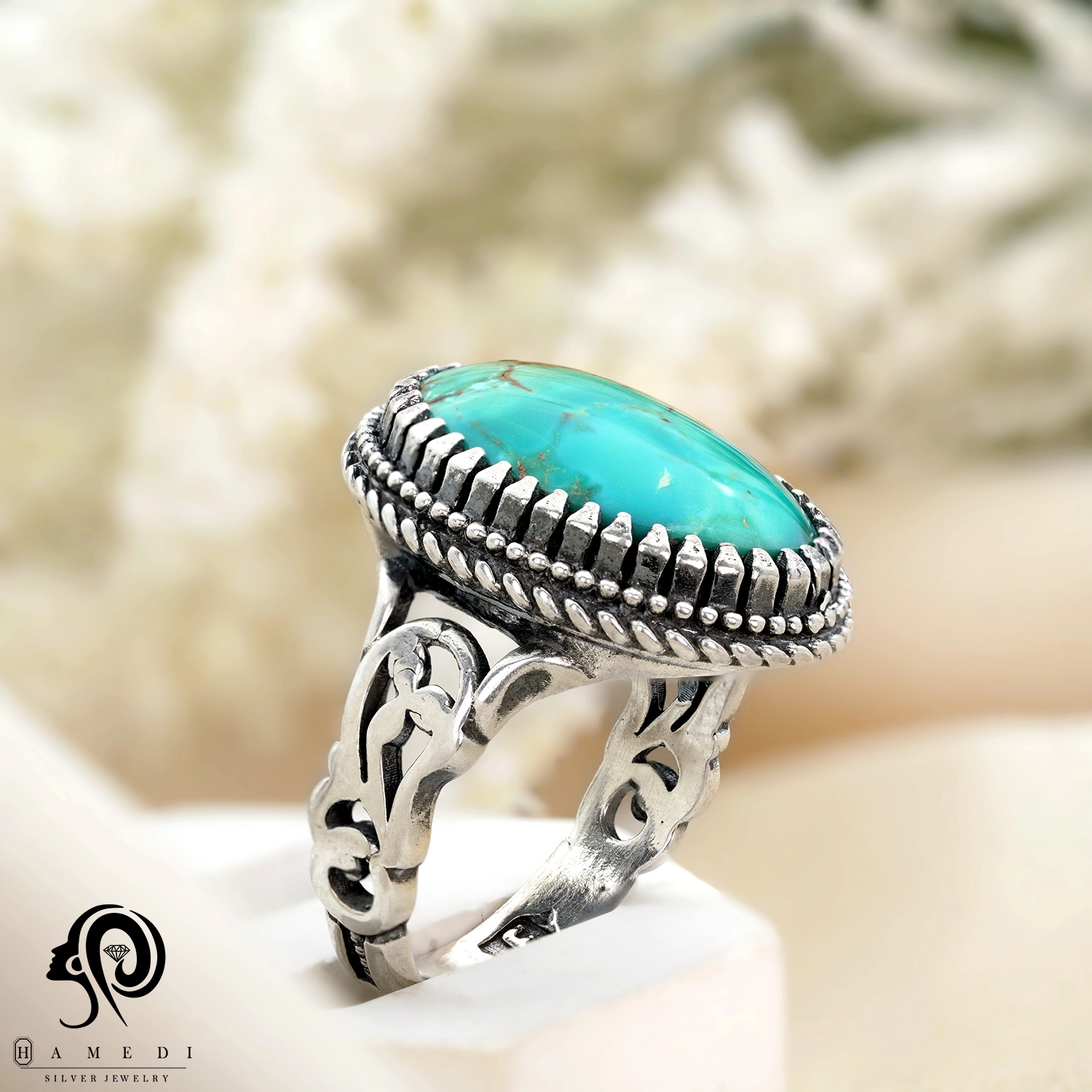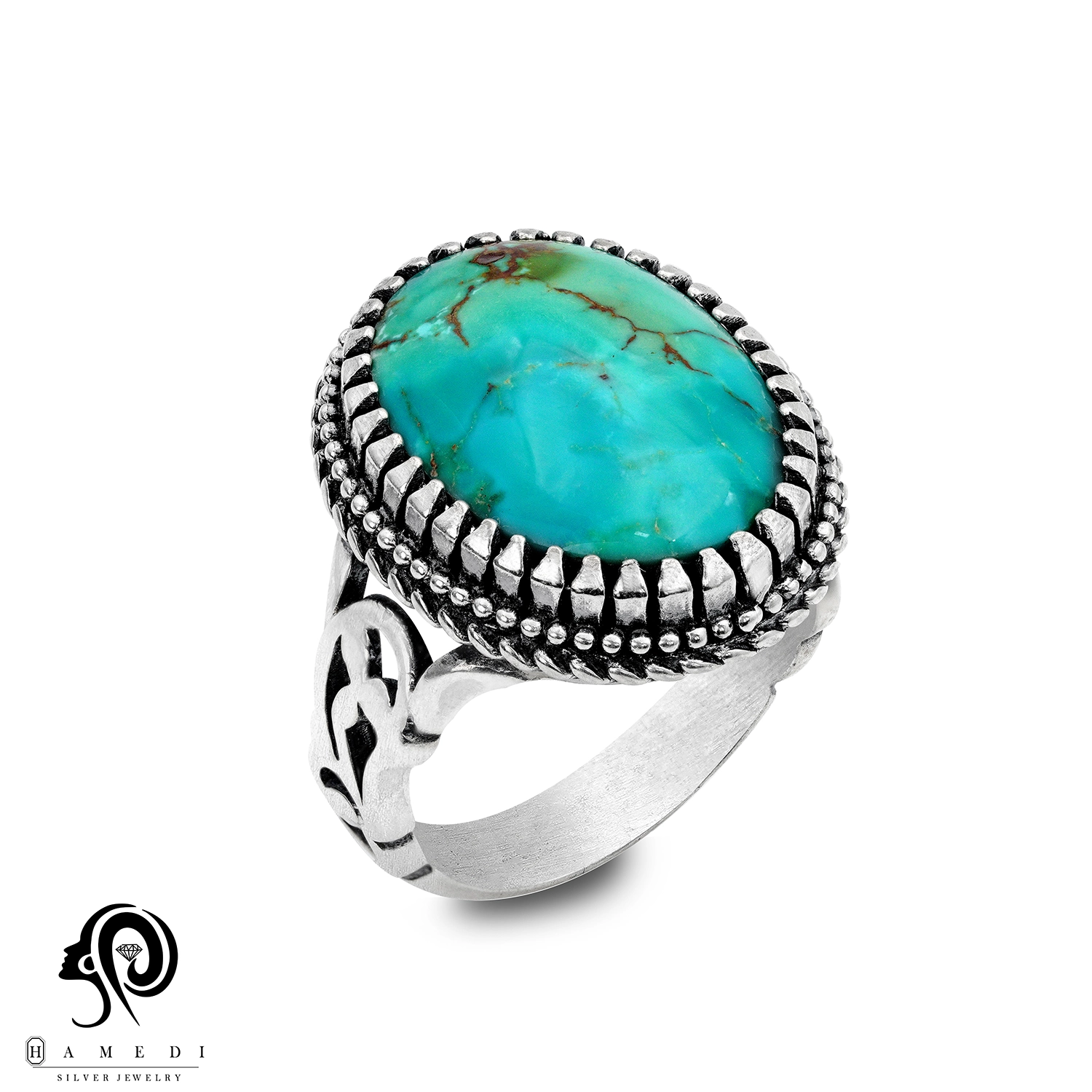 این محصول با سنگ فیروزه نیشابور که به شکل اوال و از محبوبترین سنگ های قدیمی است.