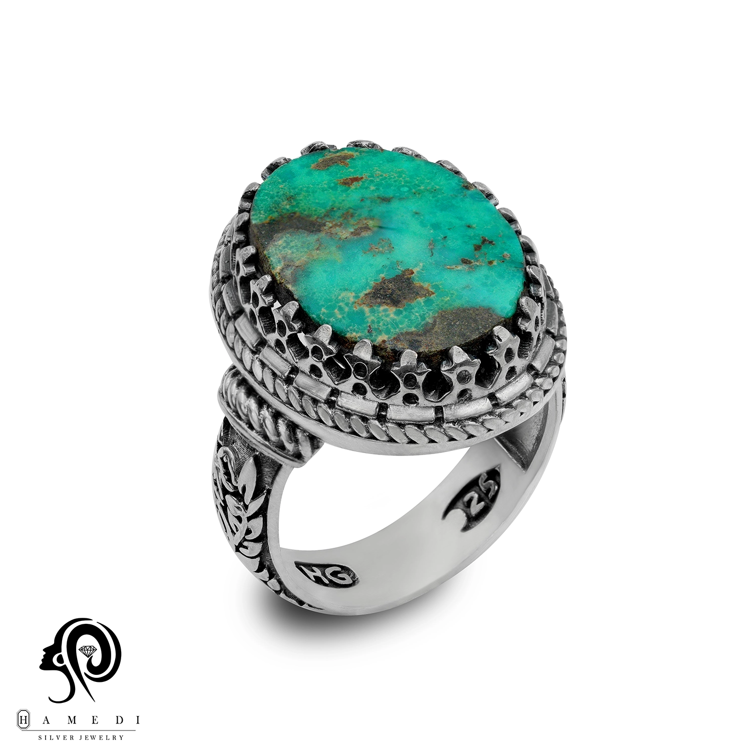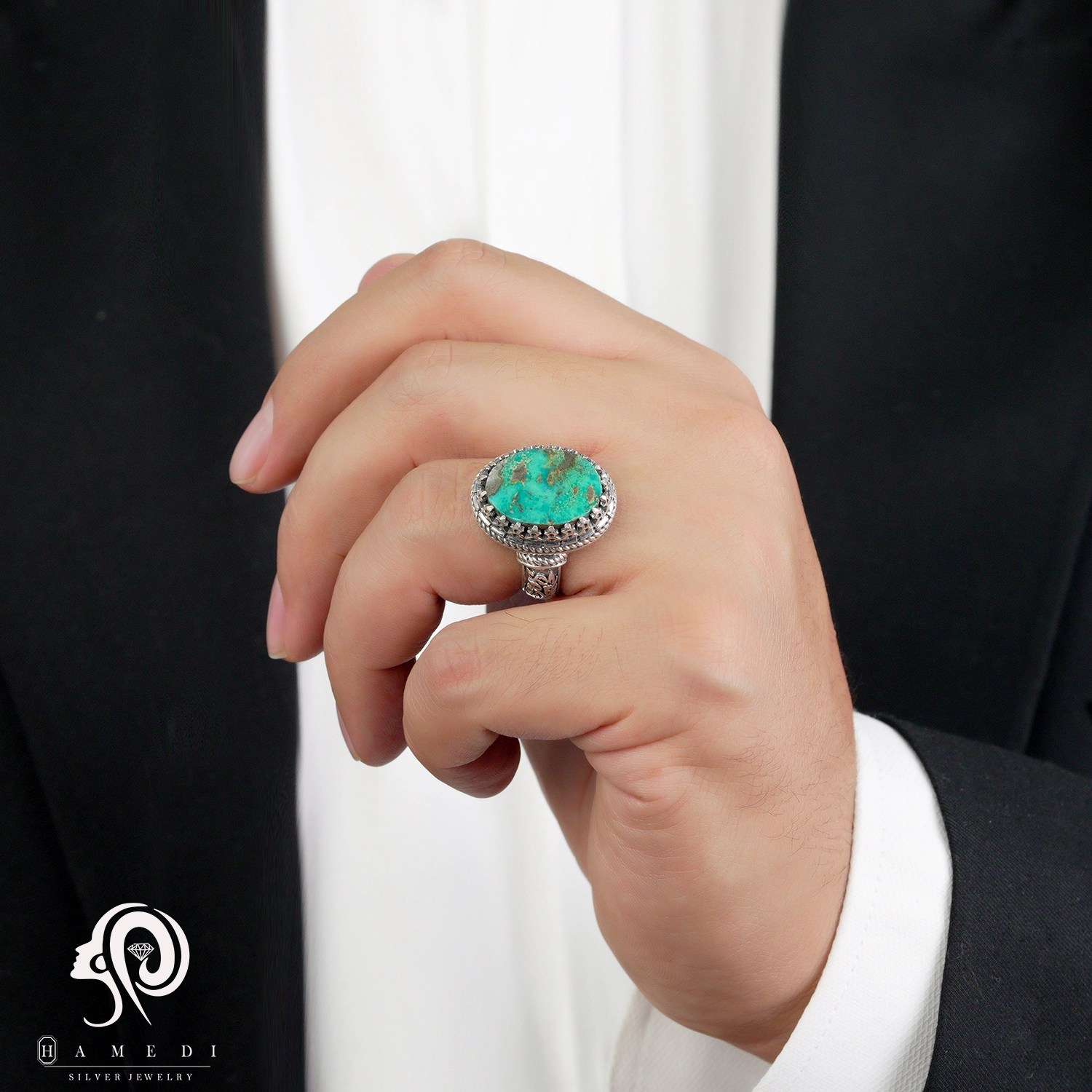 انگشتر فیروزه اصل نقره مردانه مدل RIM FI41 یکی از لوکسترین و پرطرفدارترین انگشتر های فیروزه گالری حامدی است.