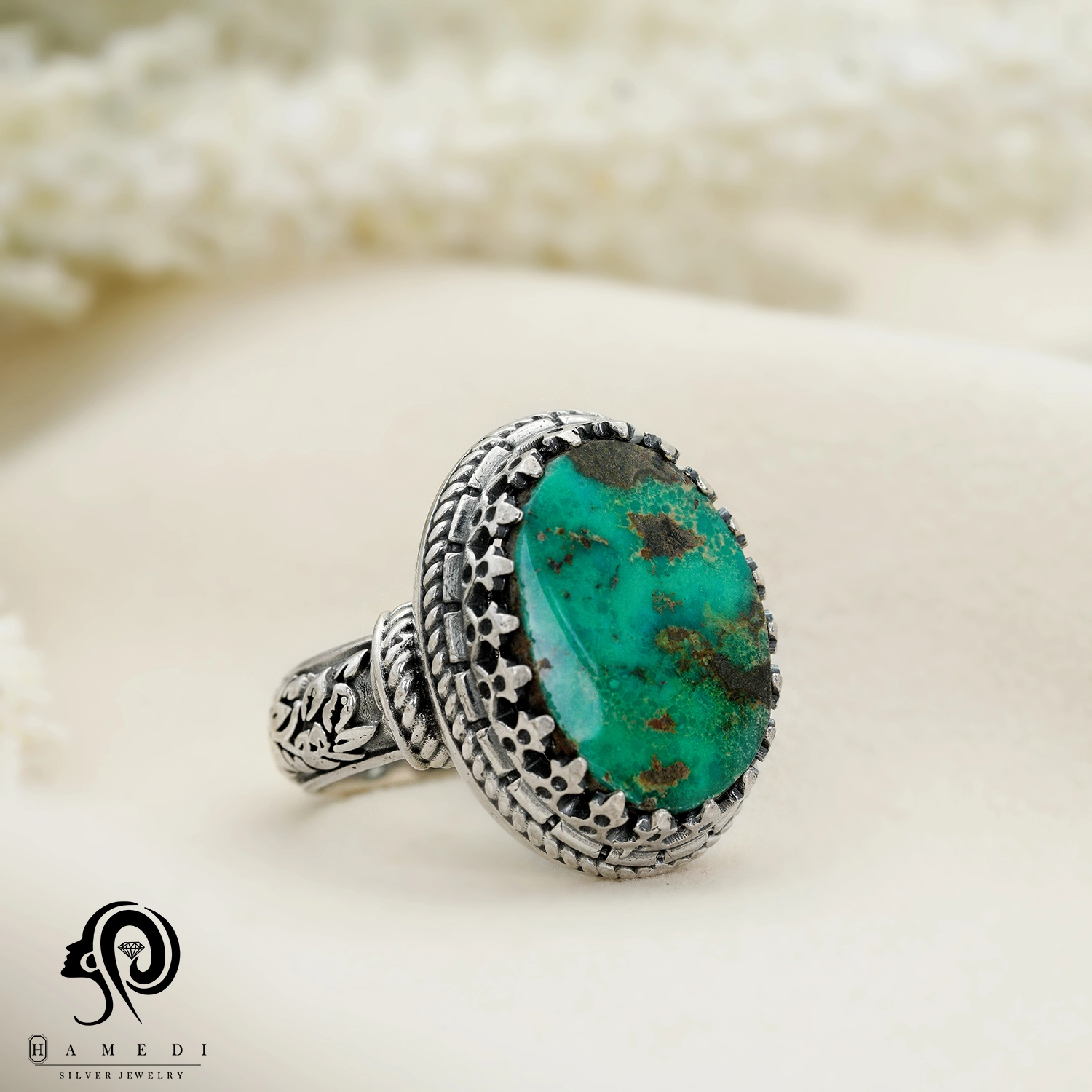 این محصول با سنگ فیروزه نیشابور که به شکل اوال و از محبوبترین سنگ های قدیمی است.