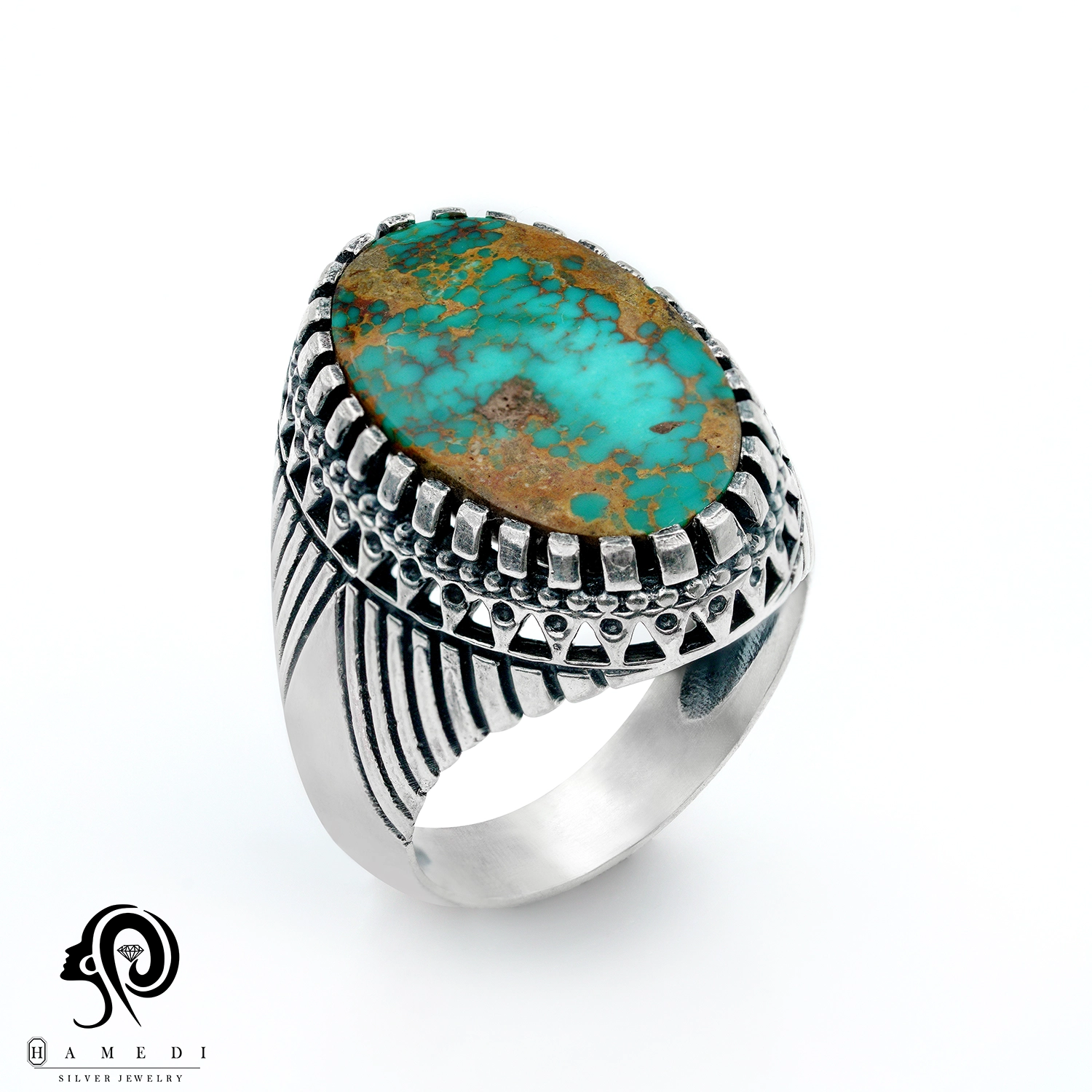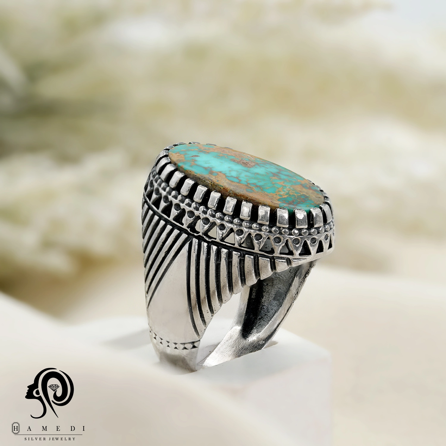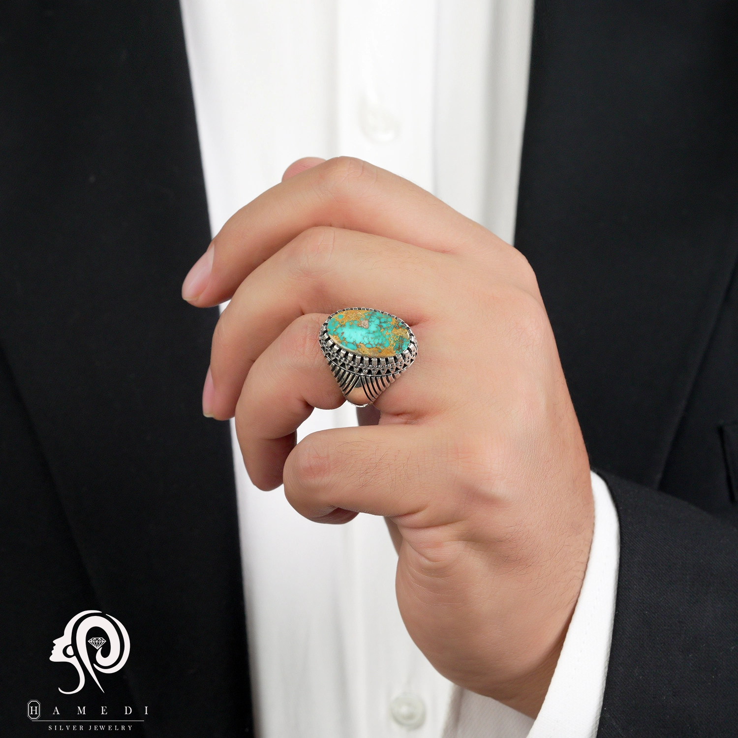 انگشتر فیروزه اصل نقره مردانه مدل RIM FI46 یکی از لوکسترین و پرطرفدارترین انگشتر های فیروزه گالری حامدی است.