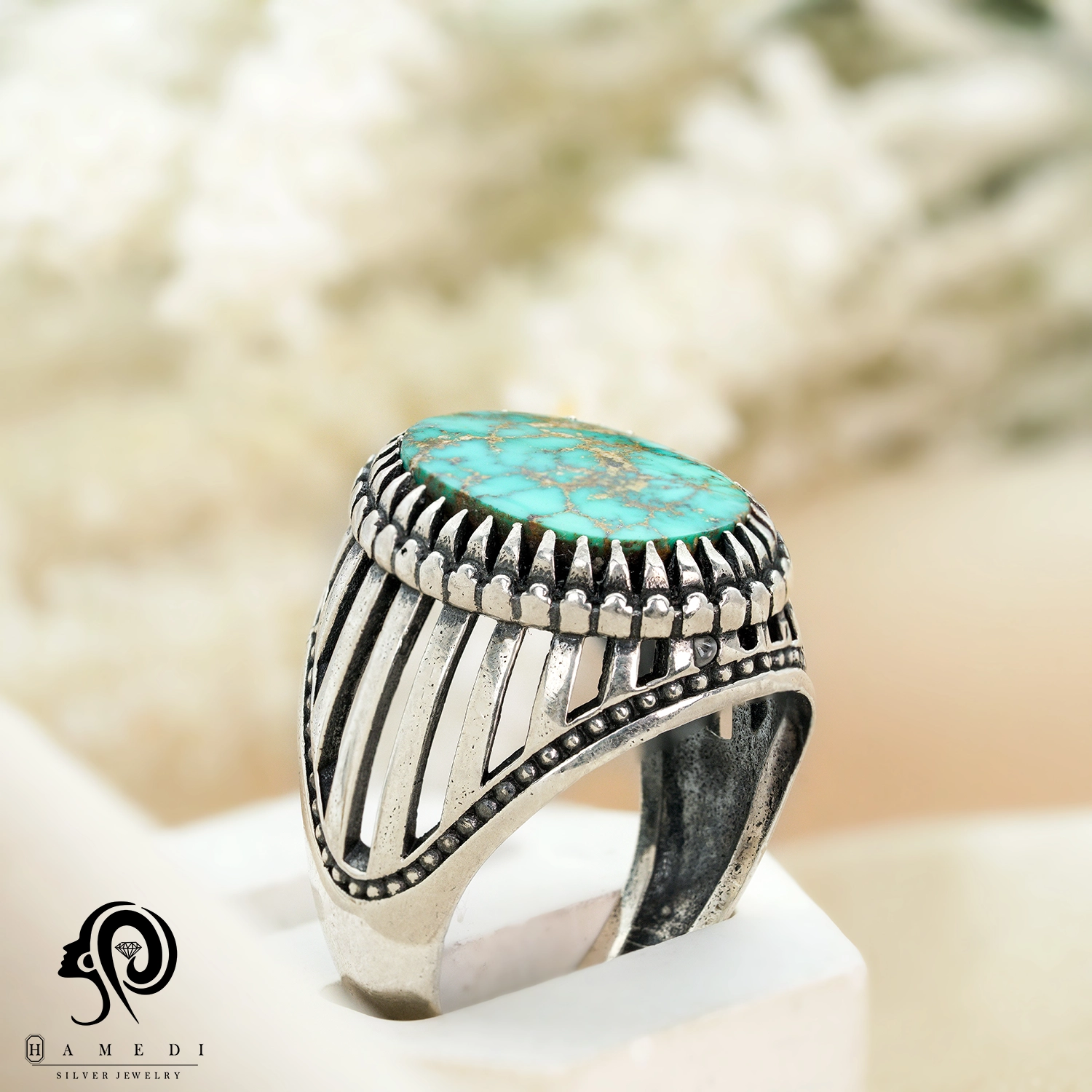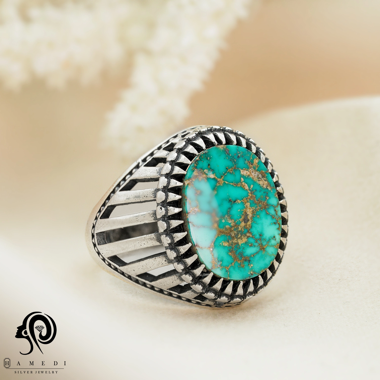 این محصول با سنگ فیروزه نیشابور که به شکل اوال و از محبوبترین سنگ های قدیمی است.