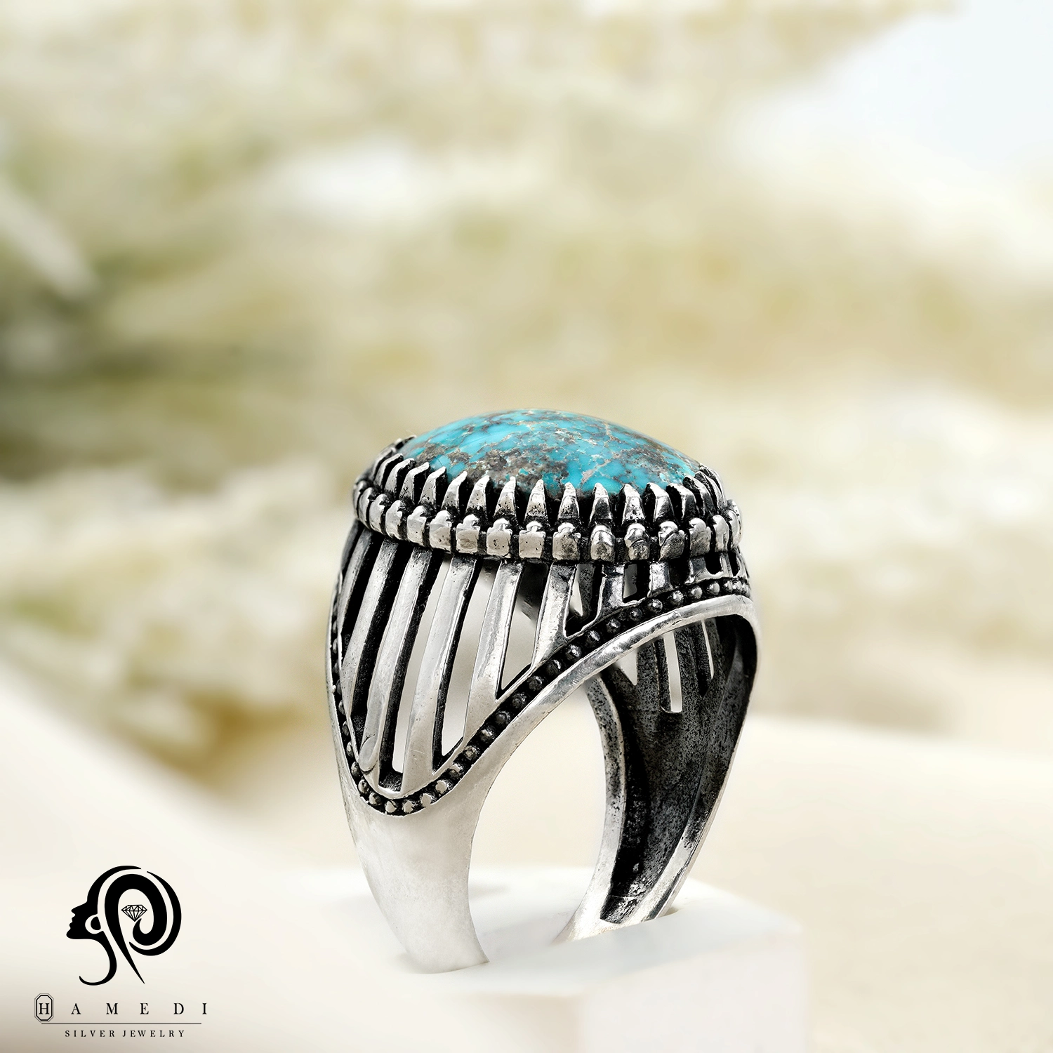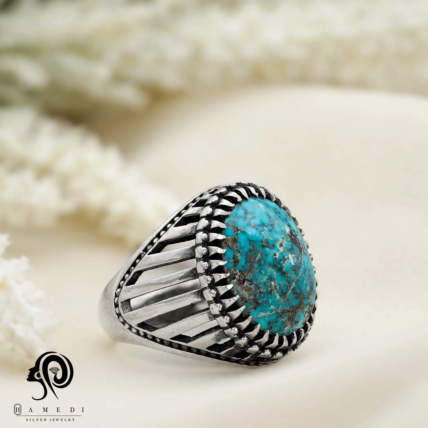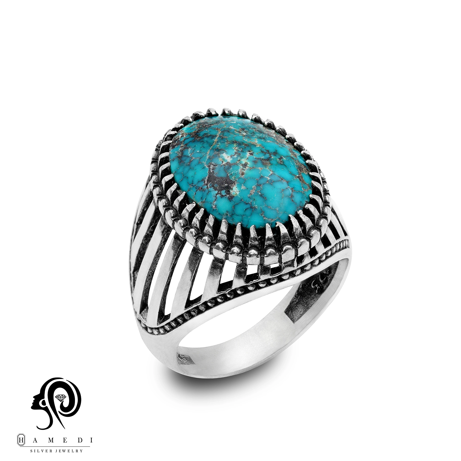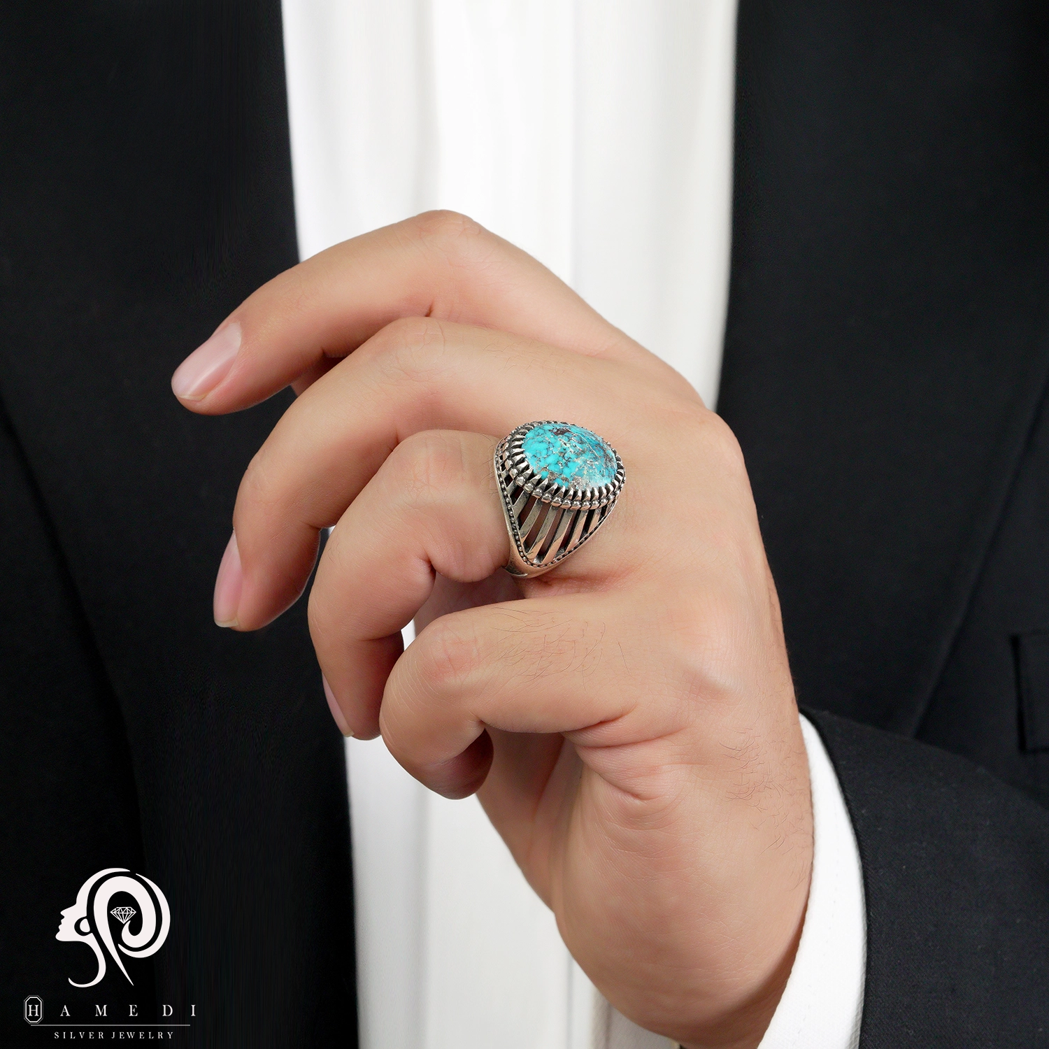انگشتر فیروزه اصل نقره مردانه مدل RIM FI49 یکی از لوکسترین و پرطرفدارترین انگشتر های فیروزه گالری حامدی است.