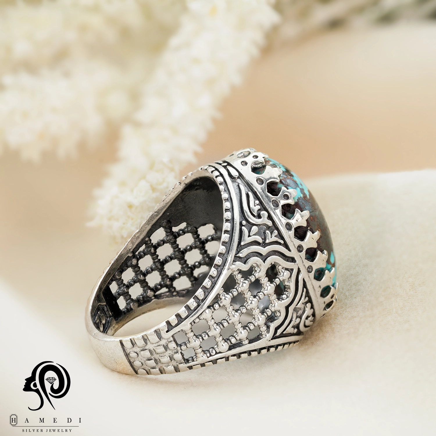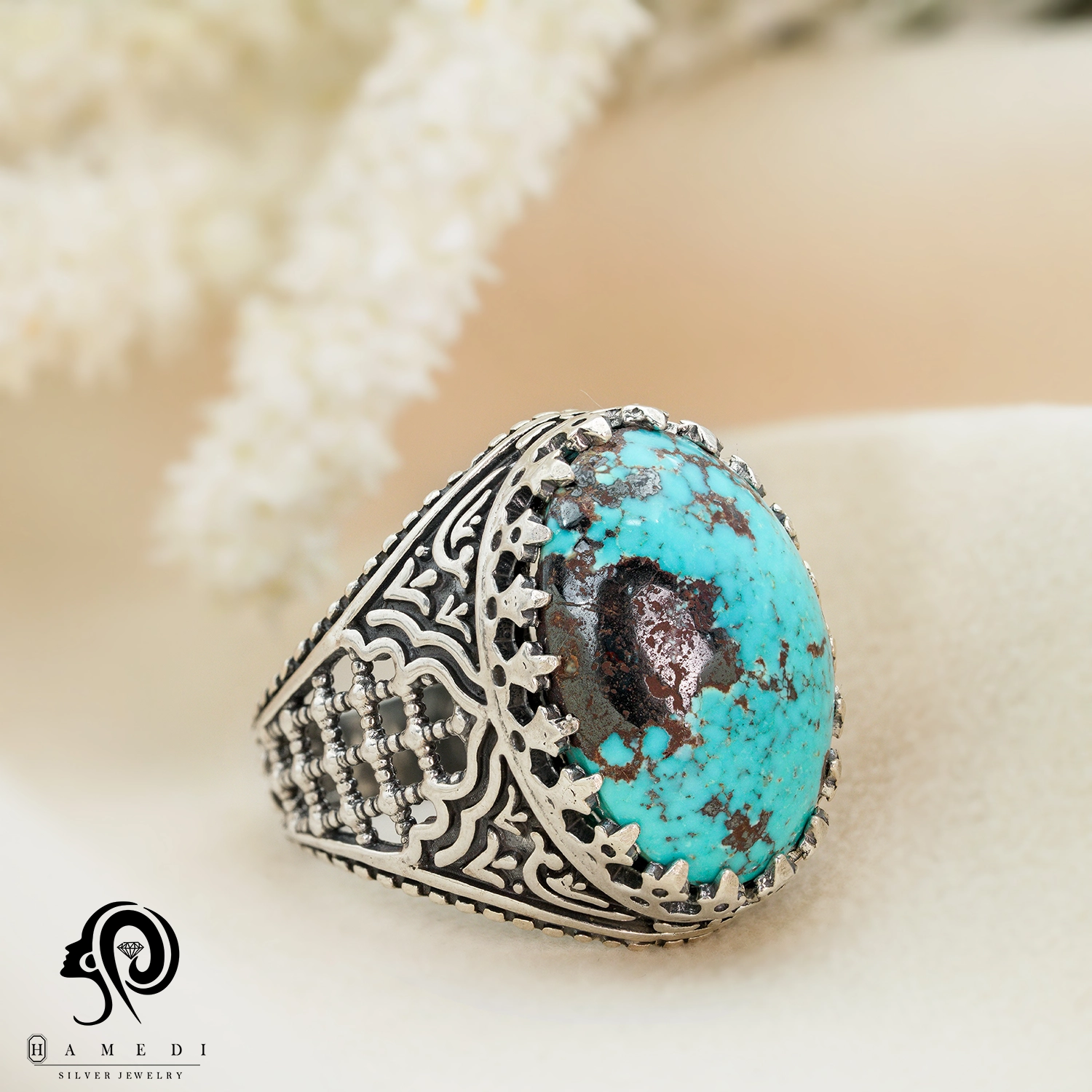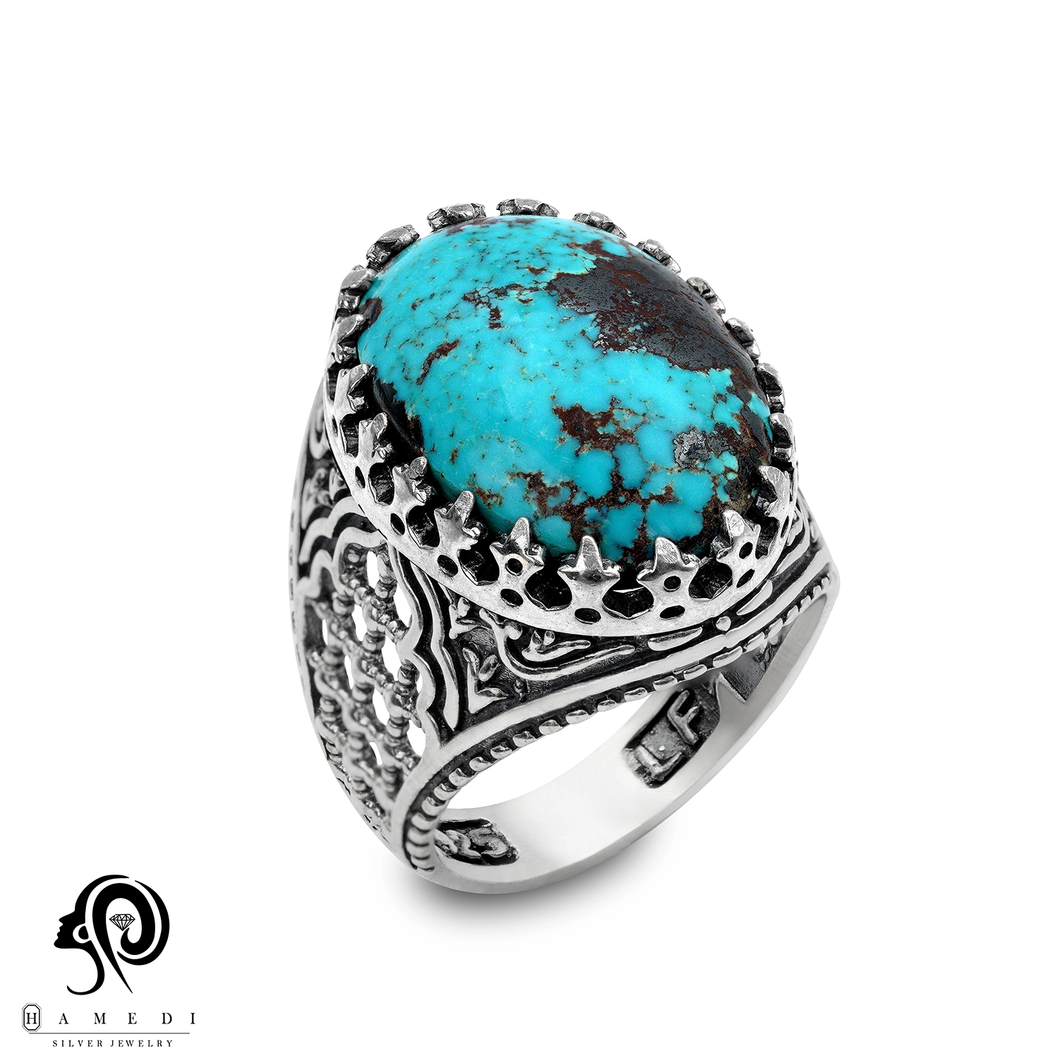 انگشتر فیروزه مردانه نقره اصل مدل RIM FI52 یکی از لوکسترین و پرطرفدارترین انگشتر های فیروزه گالری حامدی است.