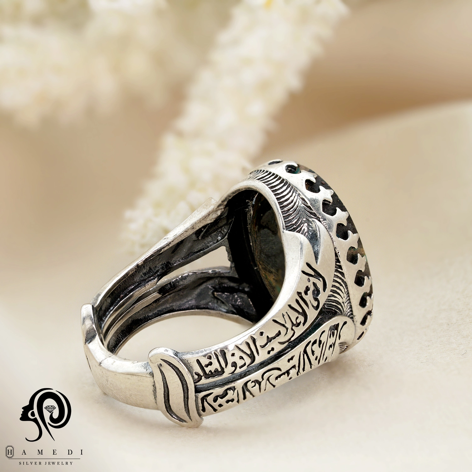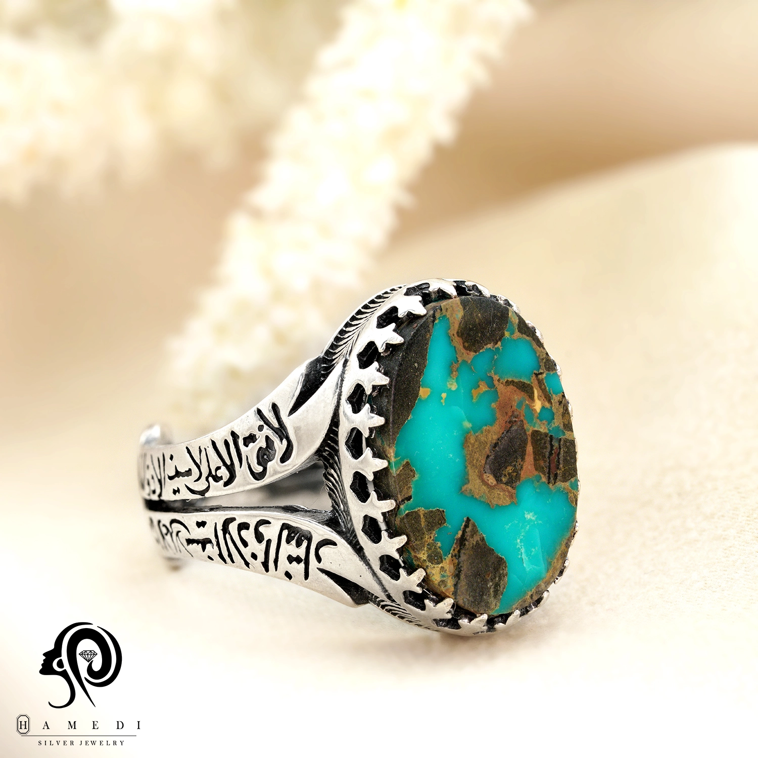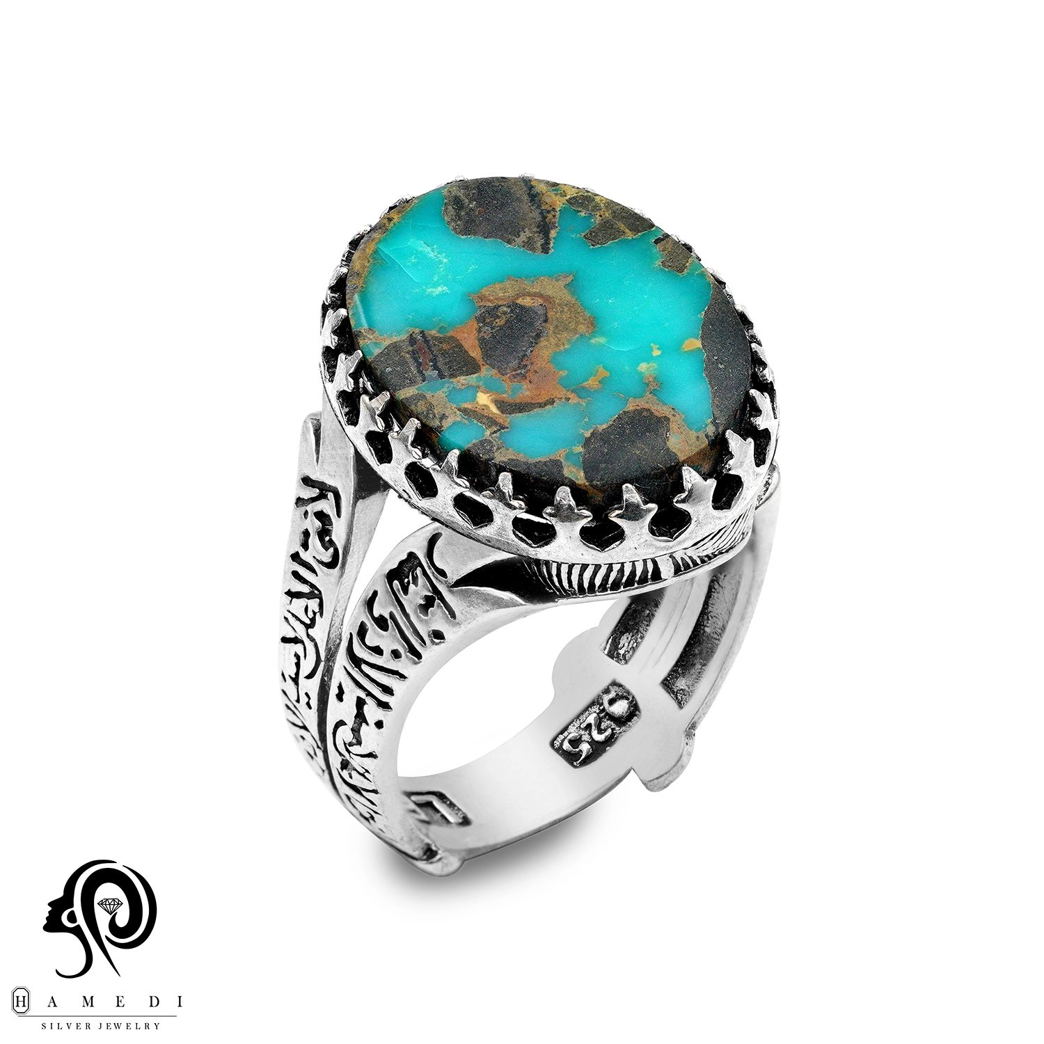 این محصول با سنگ فیروزه نیشابور که به شکل اوال و از محبوبترین سنگ های قدیمی است.