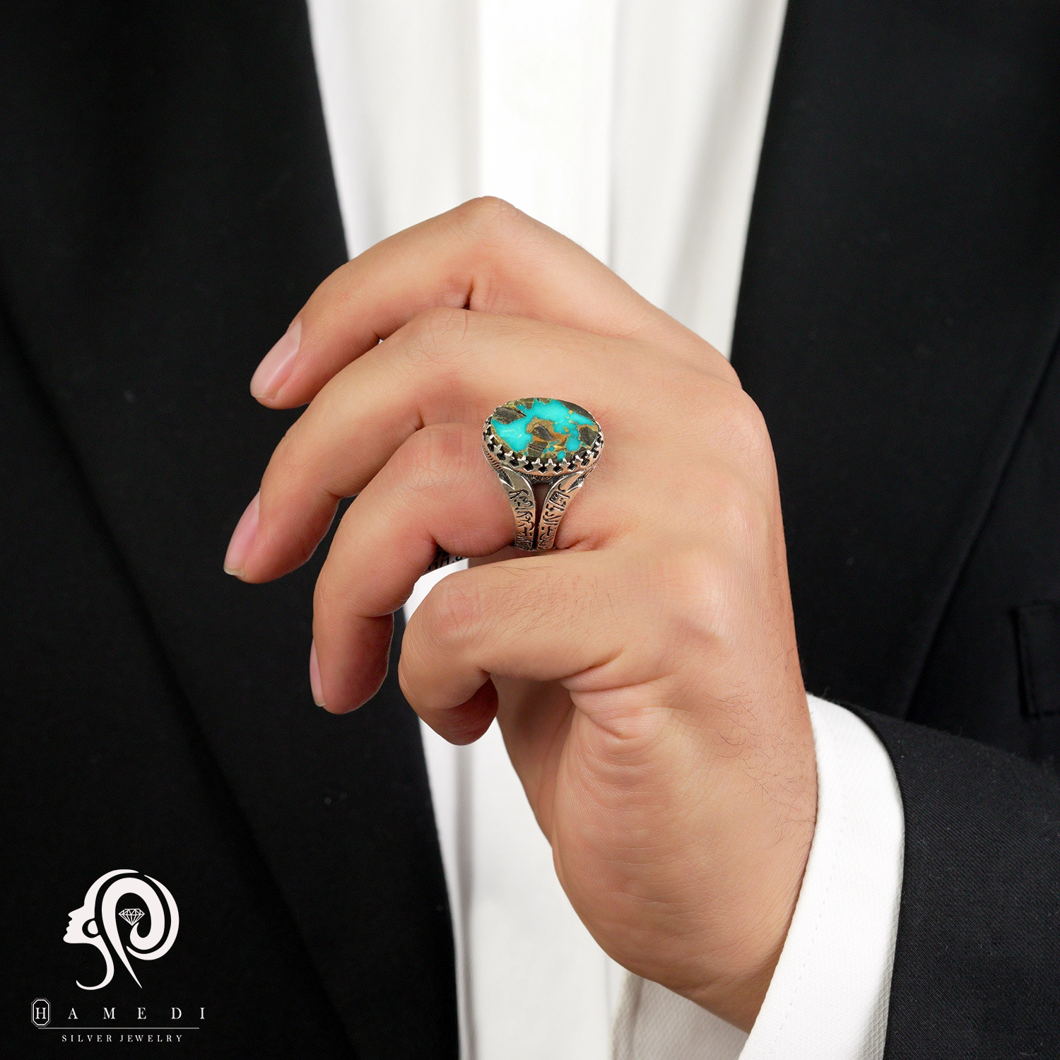 انگشتر فیروزه مردانه نقره اصل مدل RIM FI64 یکی از لوکسترین و پرطرفدارترین انگشتر های فیروزه گالری حامدی است.