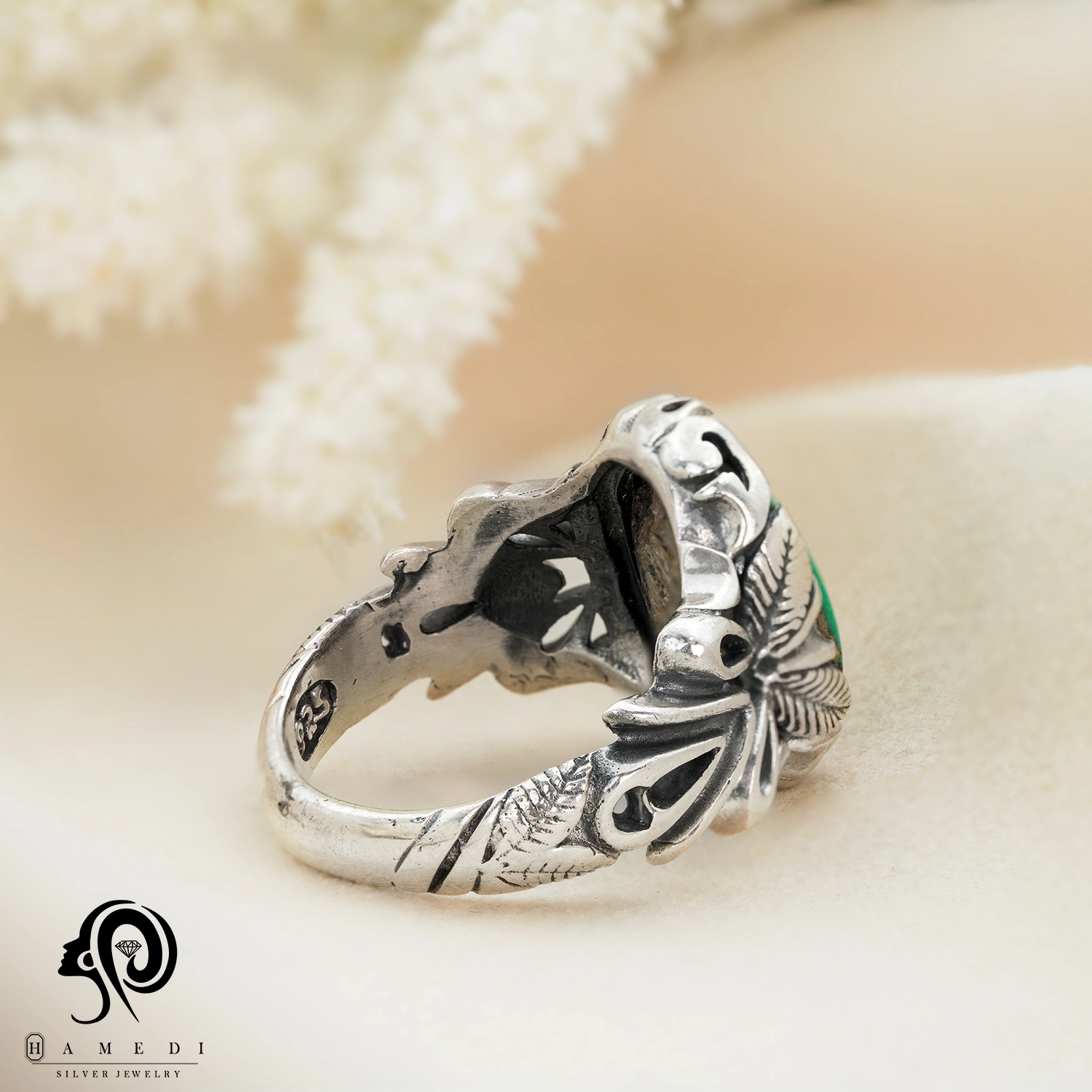 این محصول با سنگ فیروزه نیشابور که به شکل اوال و از محبوبترین سنگ های قدیمی است.
