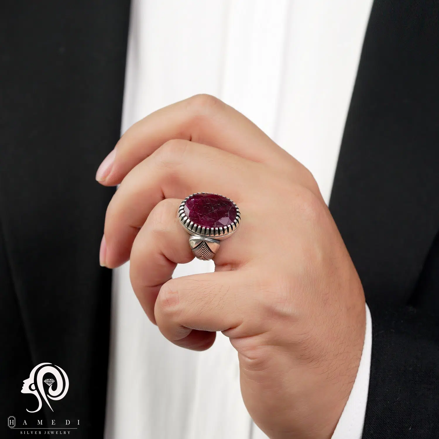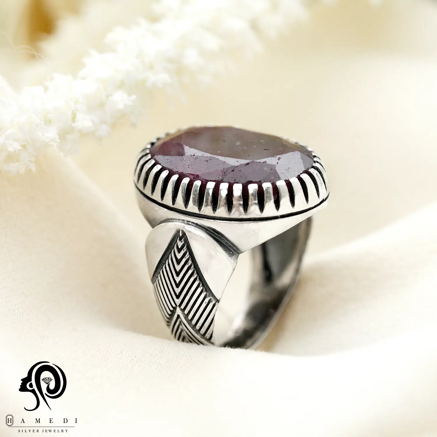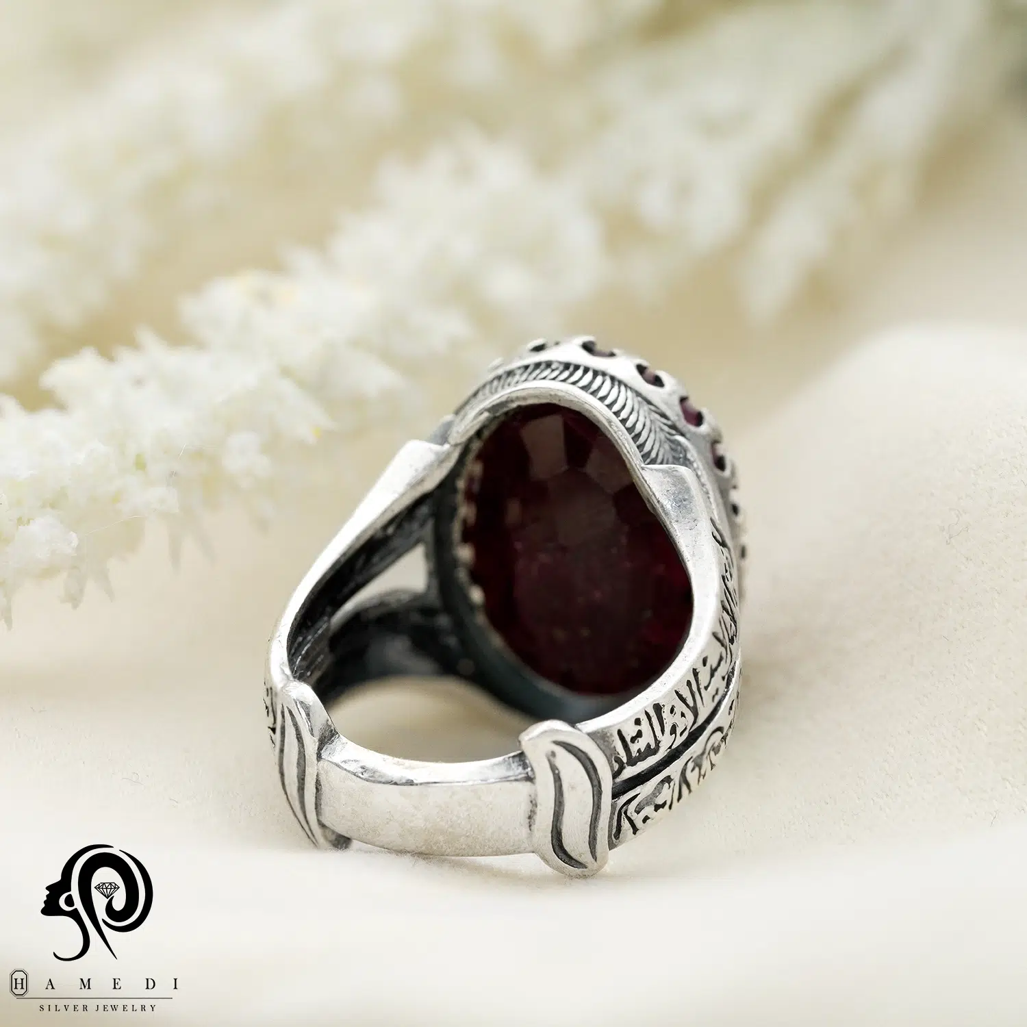 این محصول با سنگ یاقوت قرمز اصل که به شکل اوال برش خورده، عقیقها به خاطر خواص معنوی و درمانیشان معروف هستند.