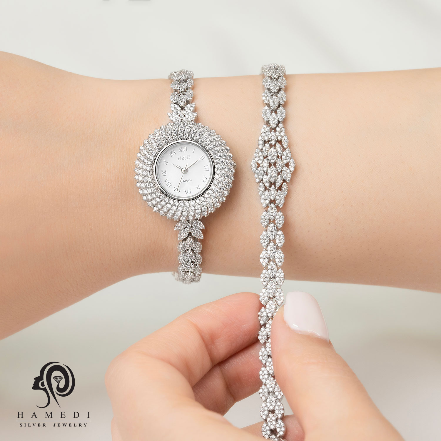 این ست هم دستبند و هم ساعت با آب رودیوم به منظور محافظت و جلا و درخشندگی بیشتر پوشانیده